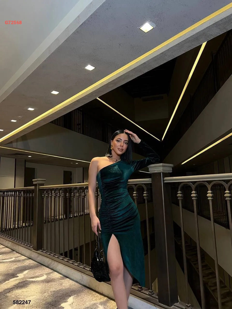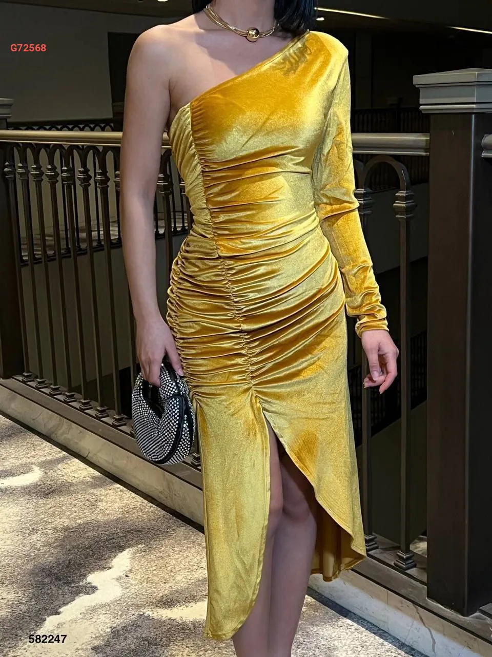 فستان مخمل مجمع بفتحة وكم واحد