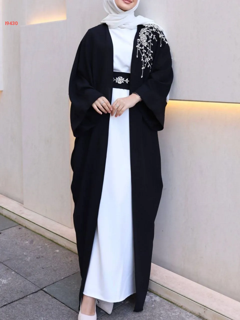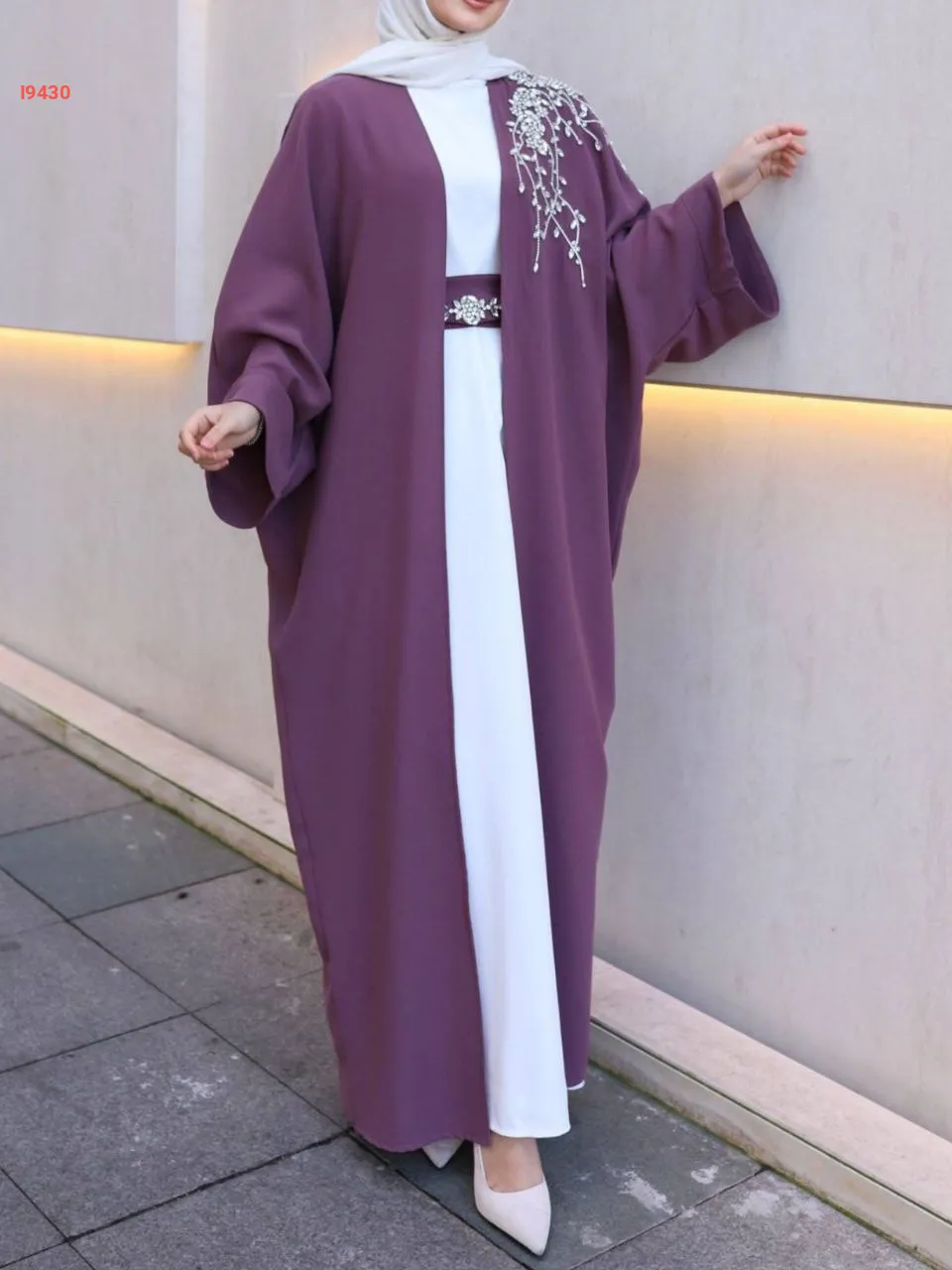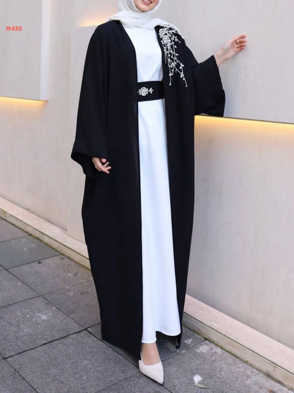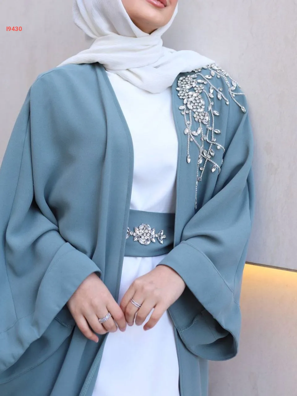 طقم عباية مزينة بعرق ألماس عند الكتف مع فستان سادة مع حزام