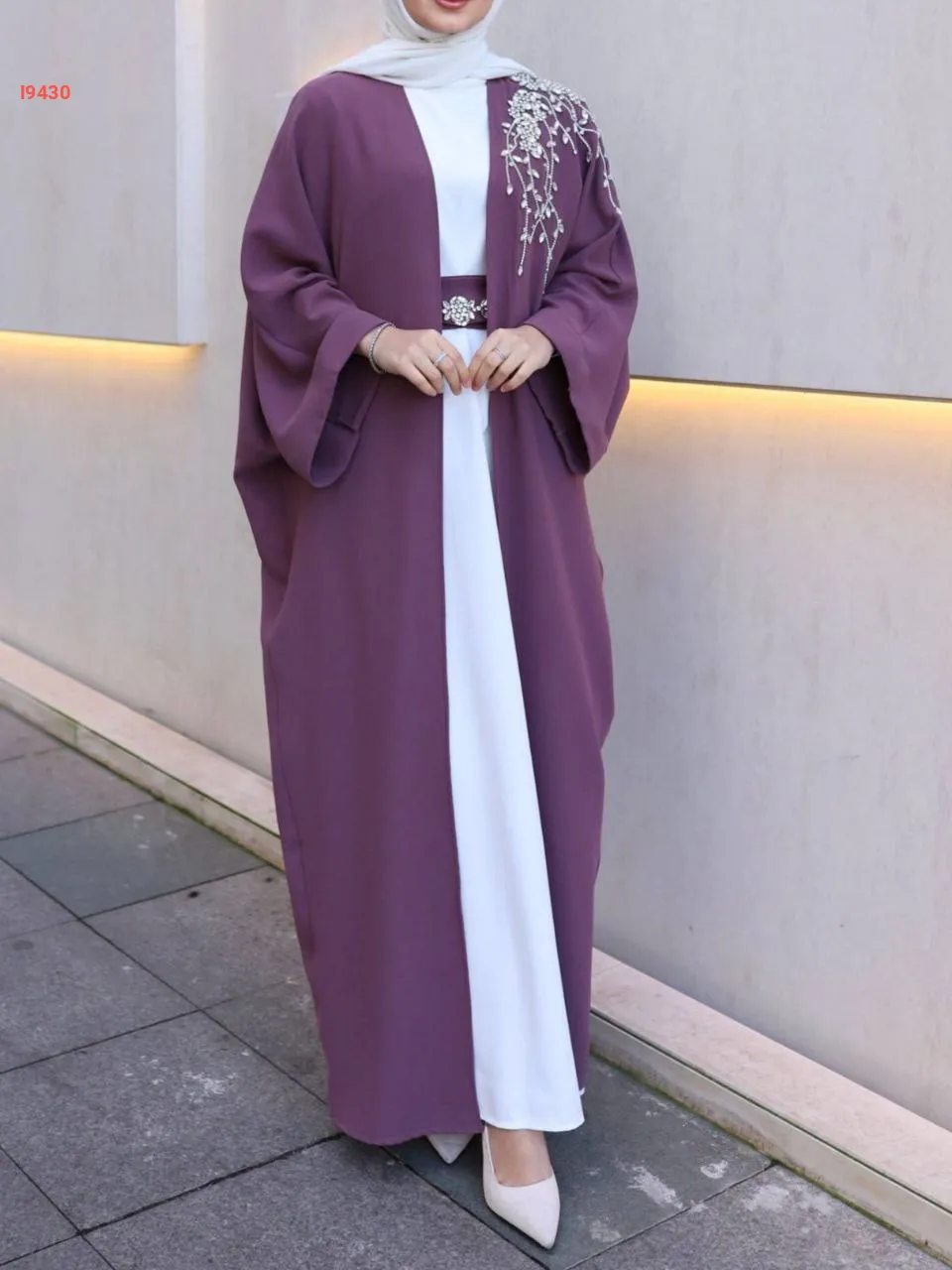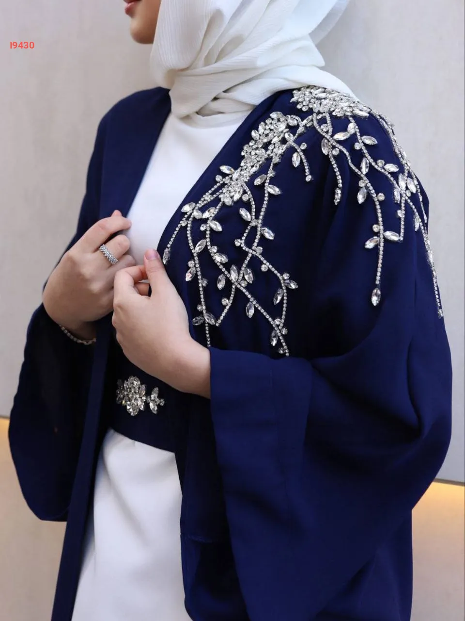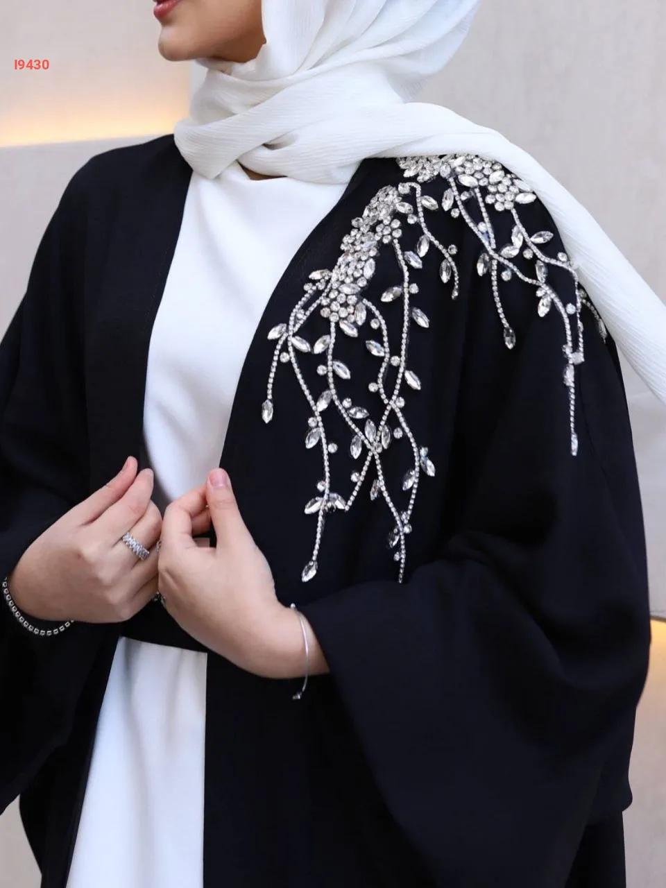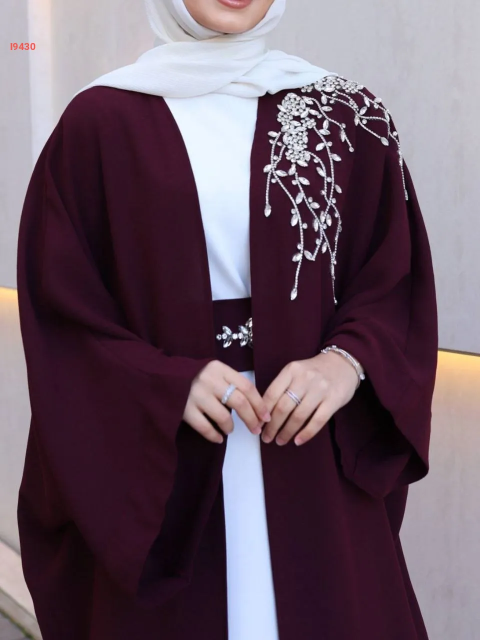 طقم عباية مزينة بعرق ألماس عند الكتف مع فستان سادة مع حزام