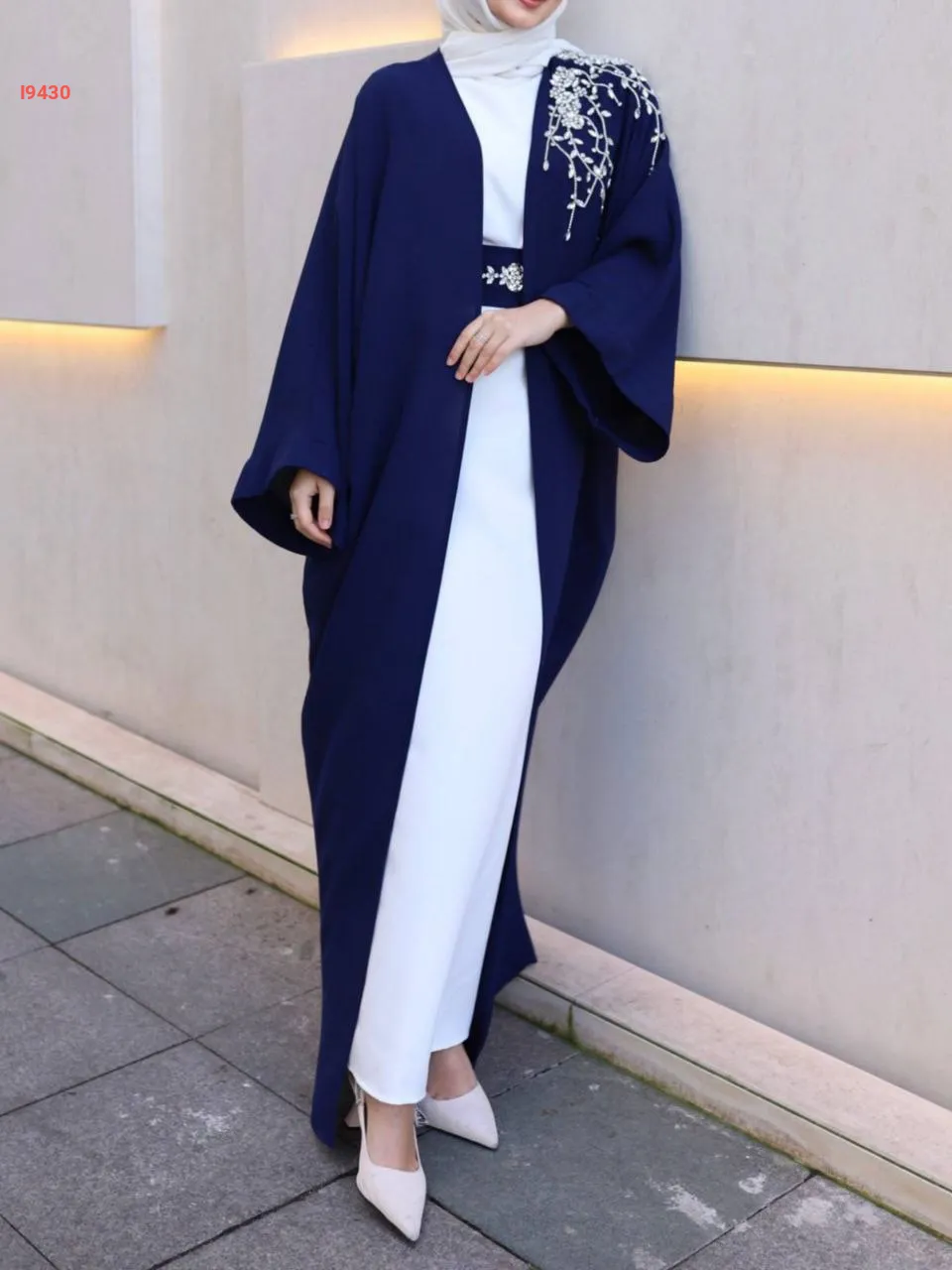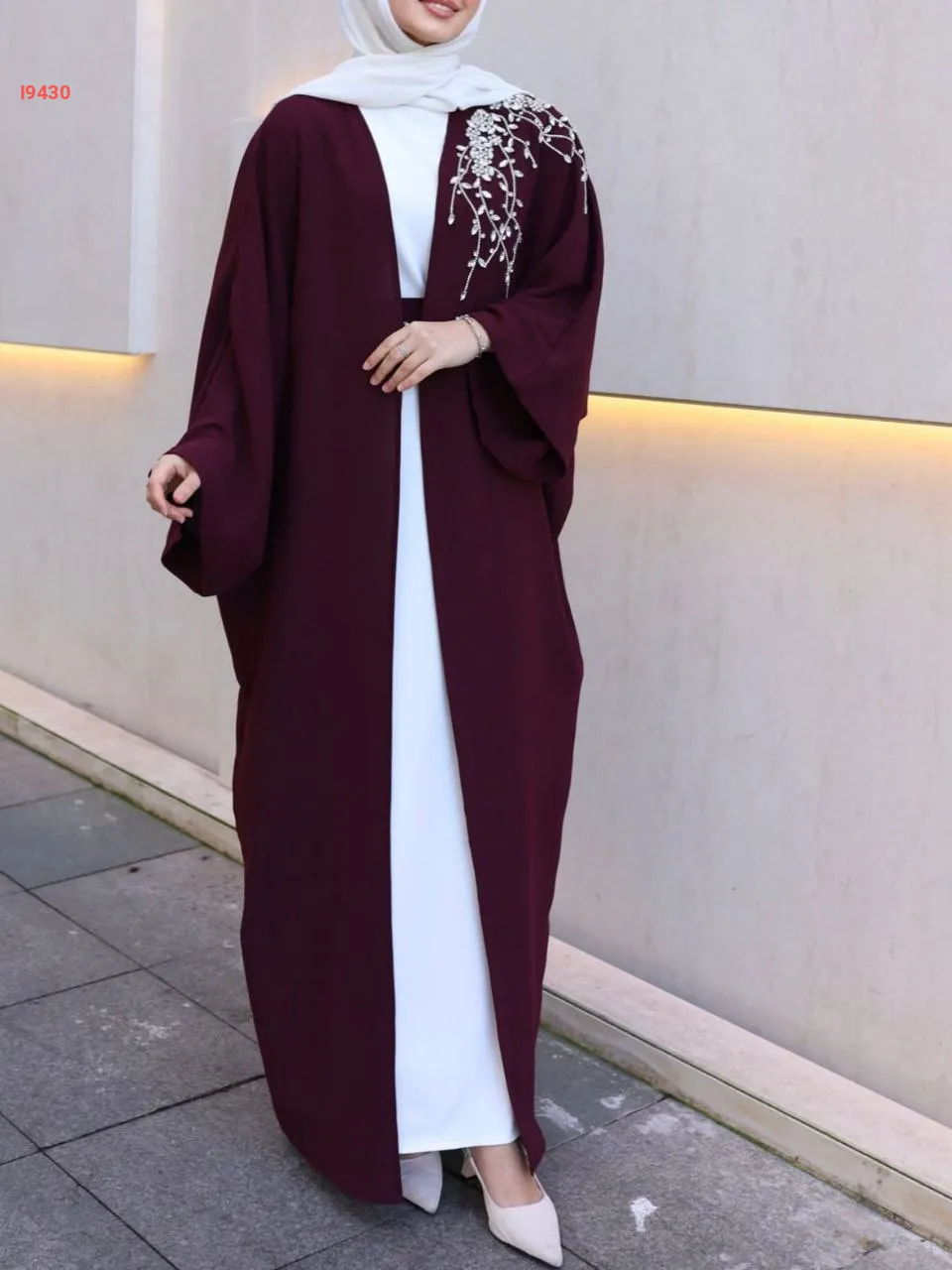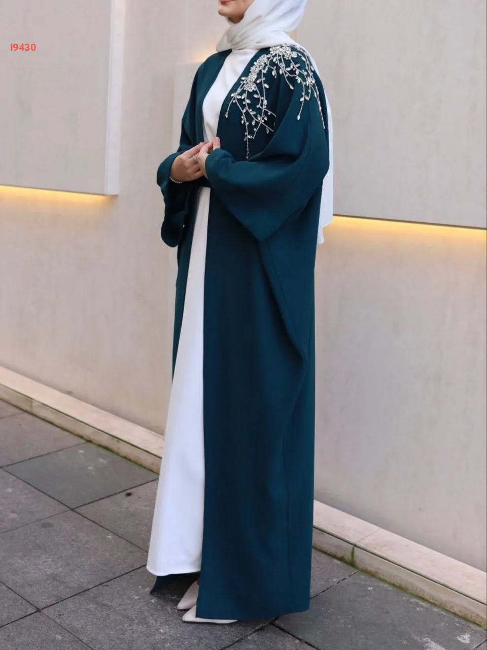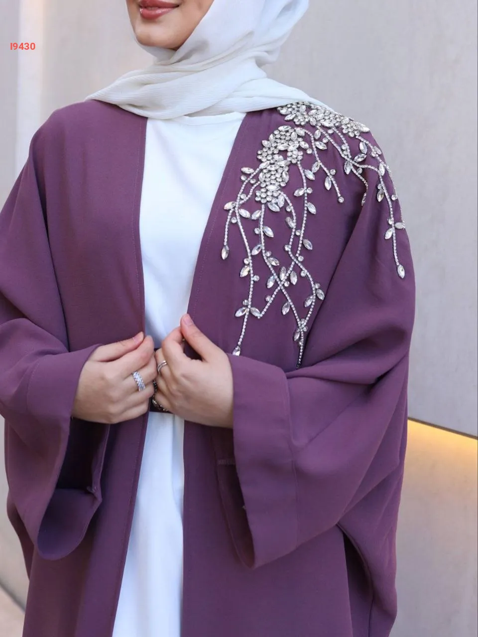 طقم عباية مزينة بعرق ألماس عند الكتف مع فستان سادة مع حزام
