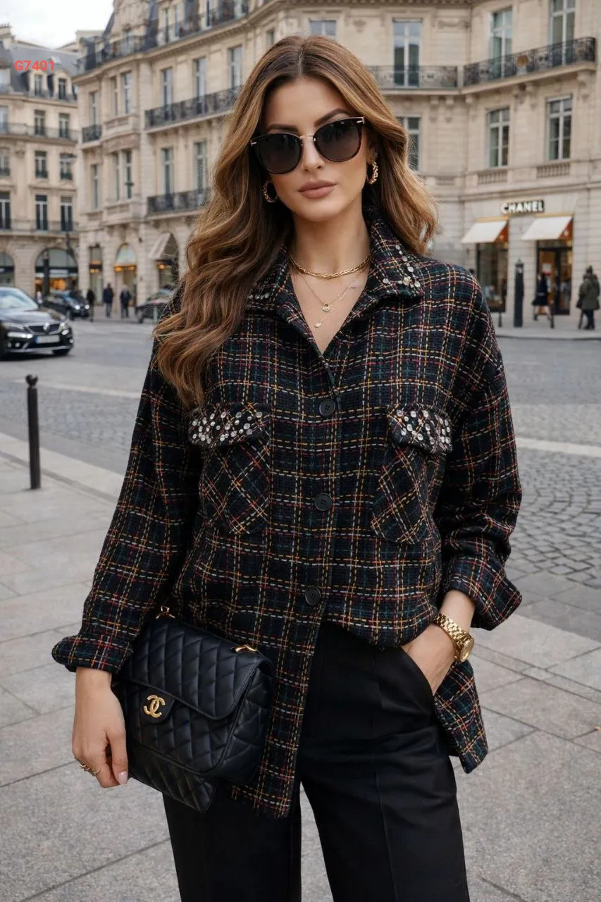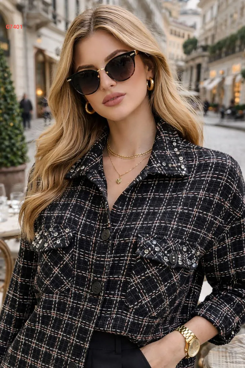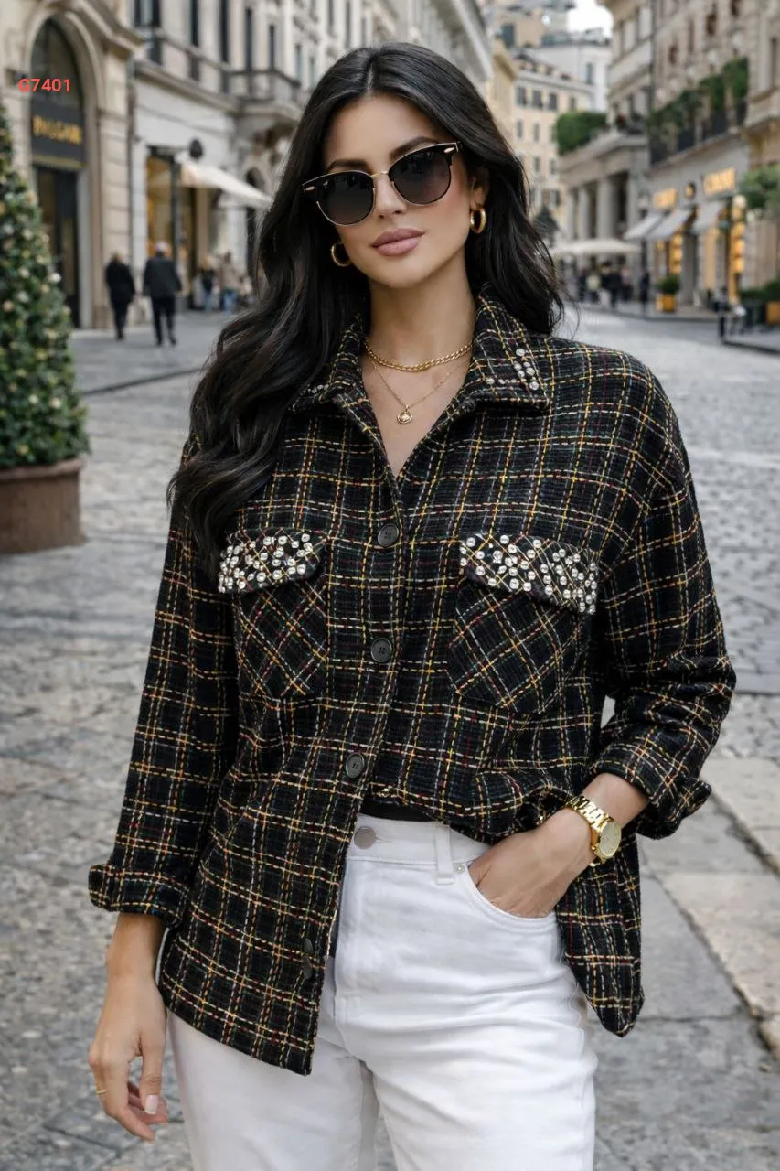 قميص كارو بجيوب وتفاصيل حجرية