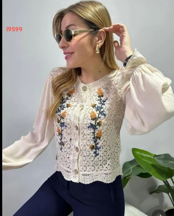بلوزة مطرزة بأزرار وأكمام بالونية