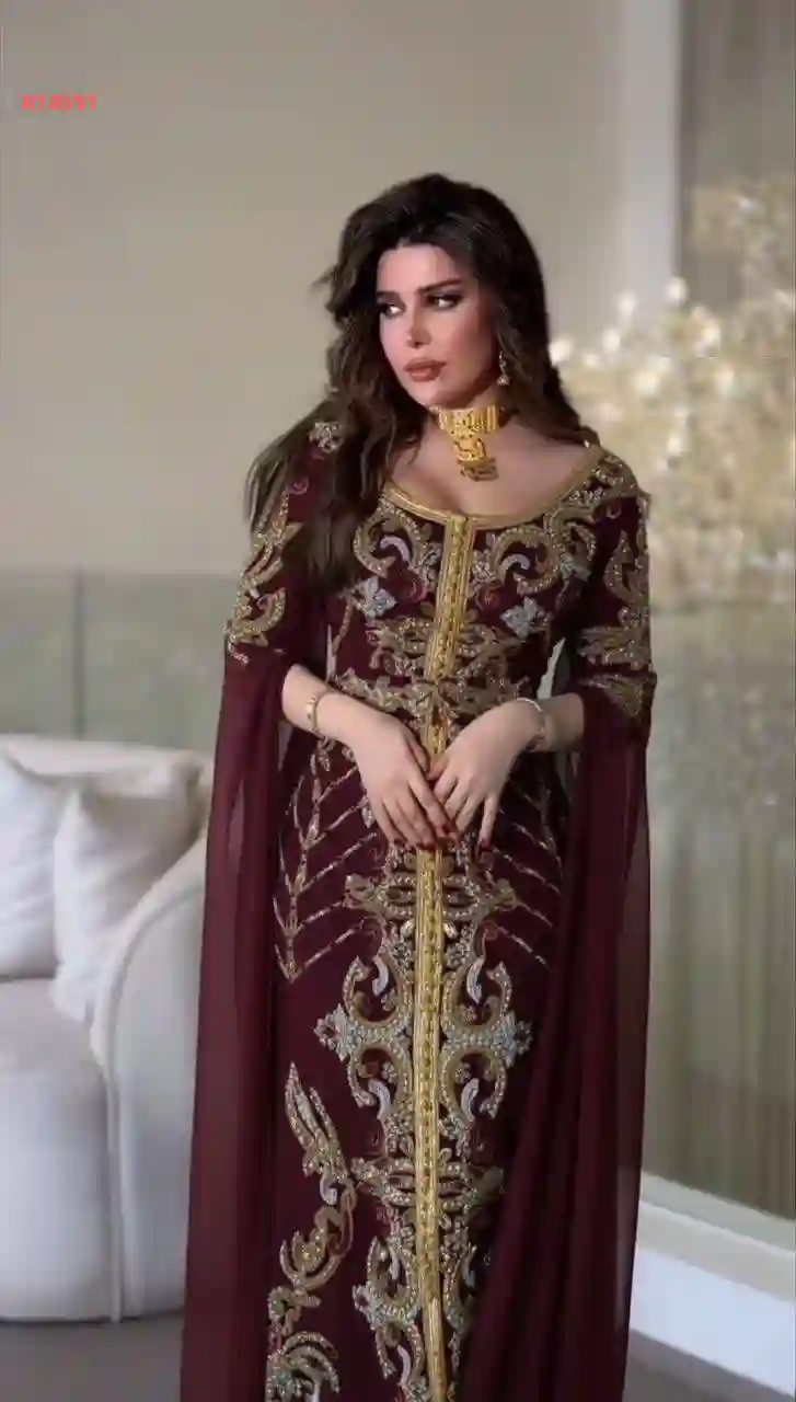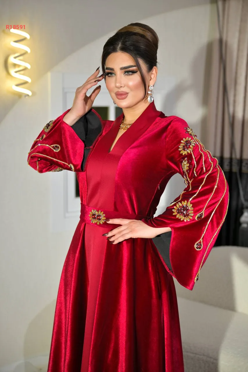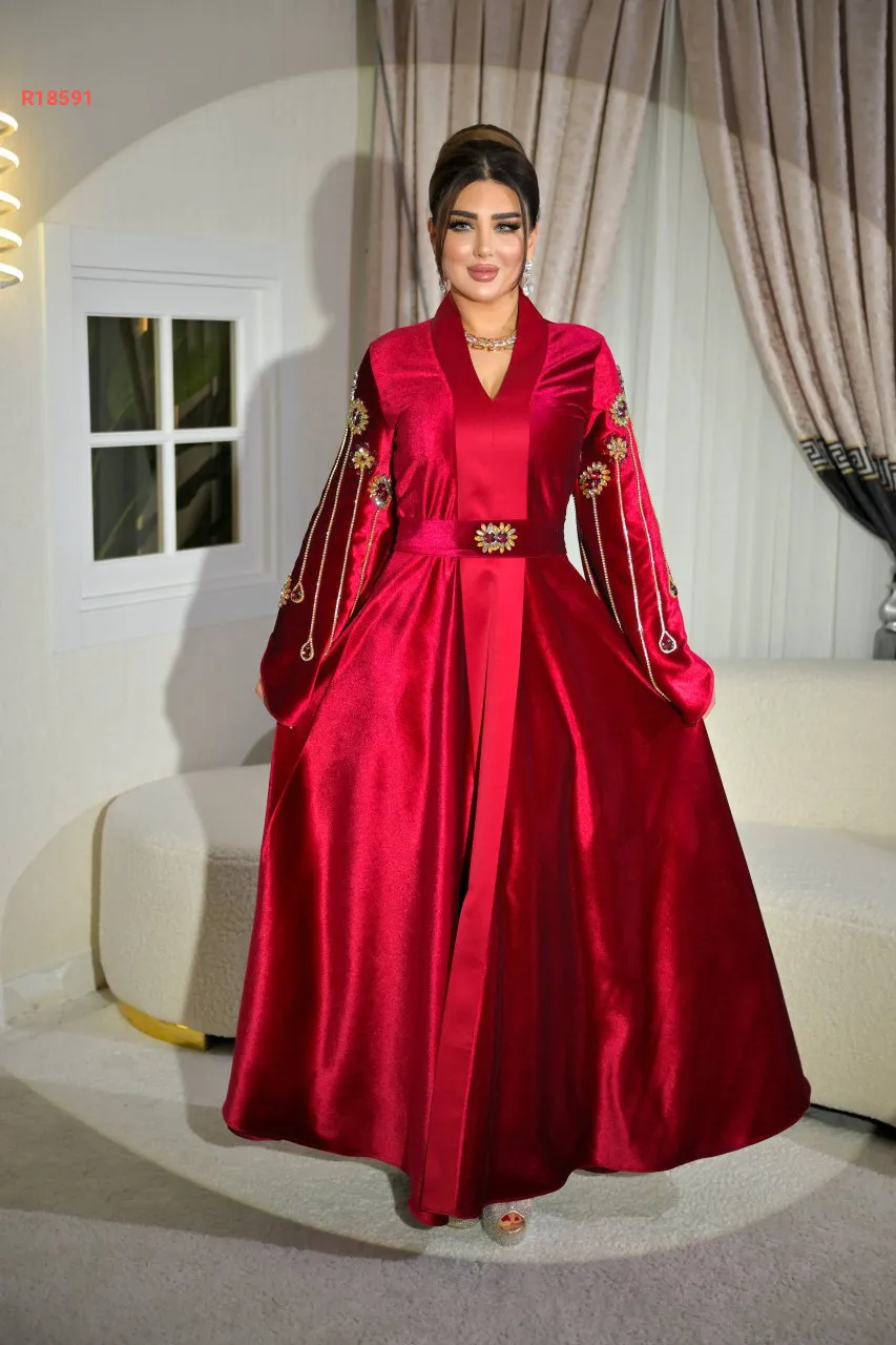 قفطان سادة بأكمام واسعة مع خطوط ألماس وكريستال وحزام