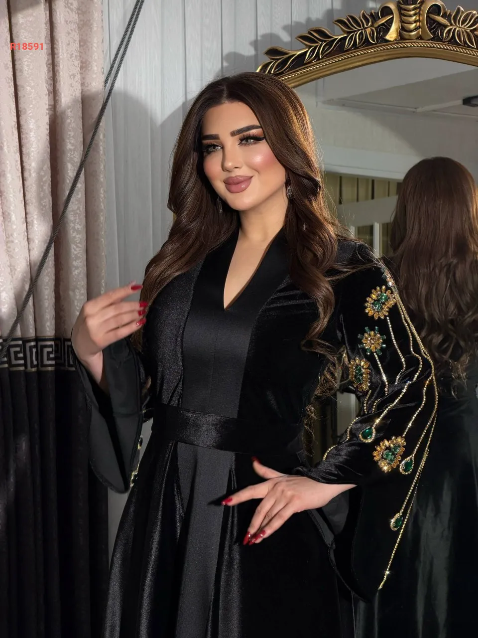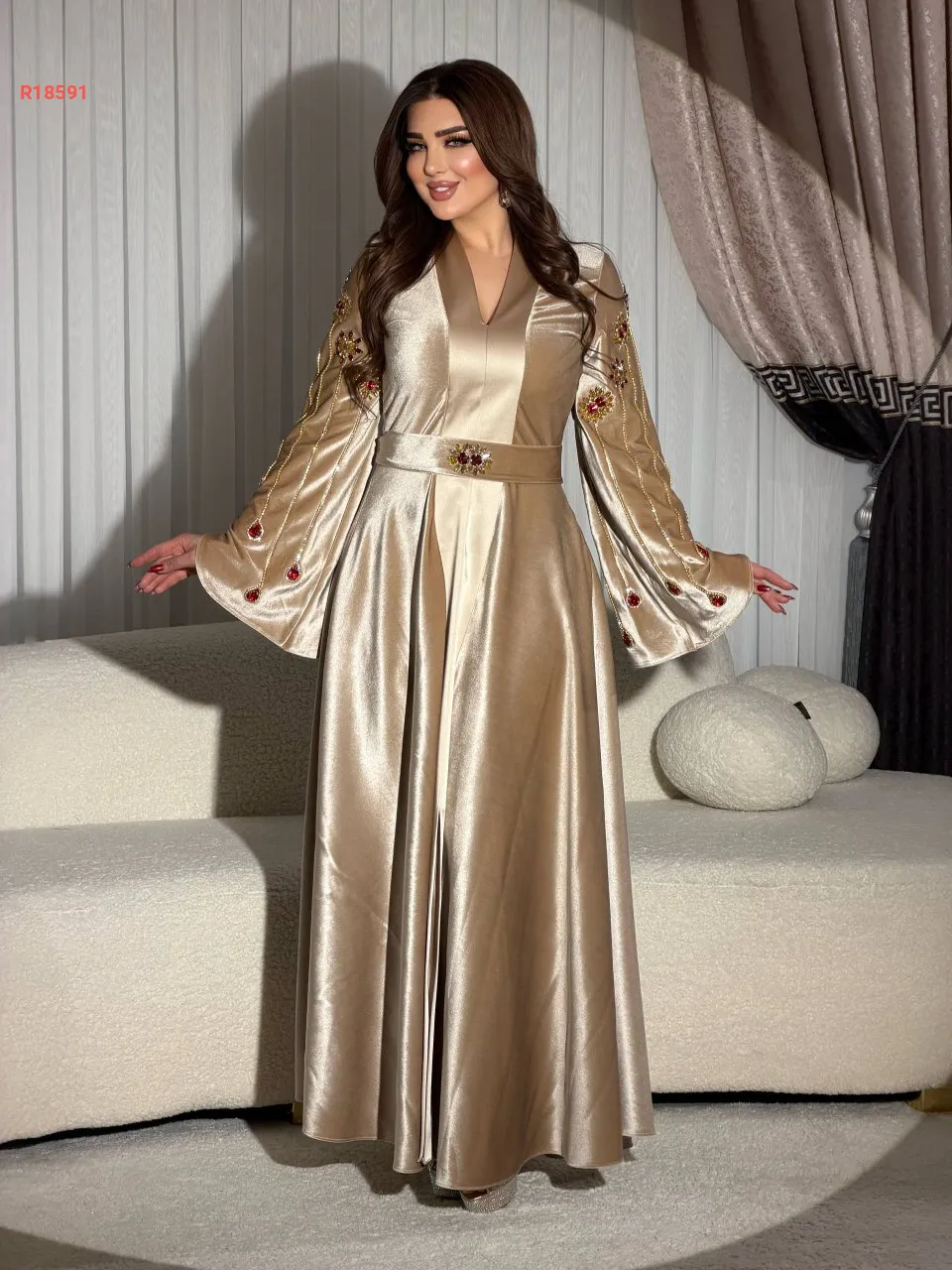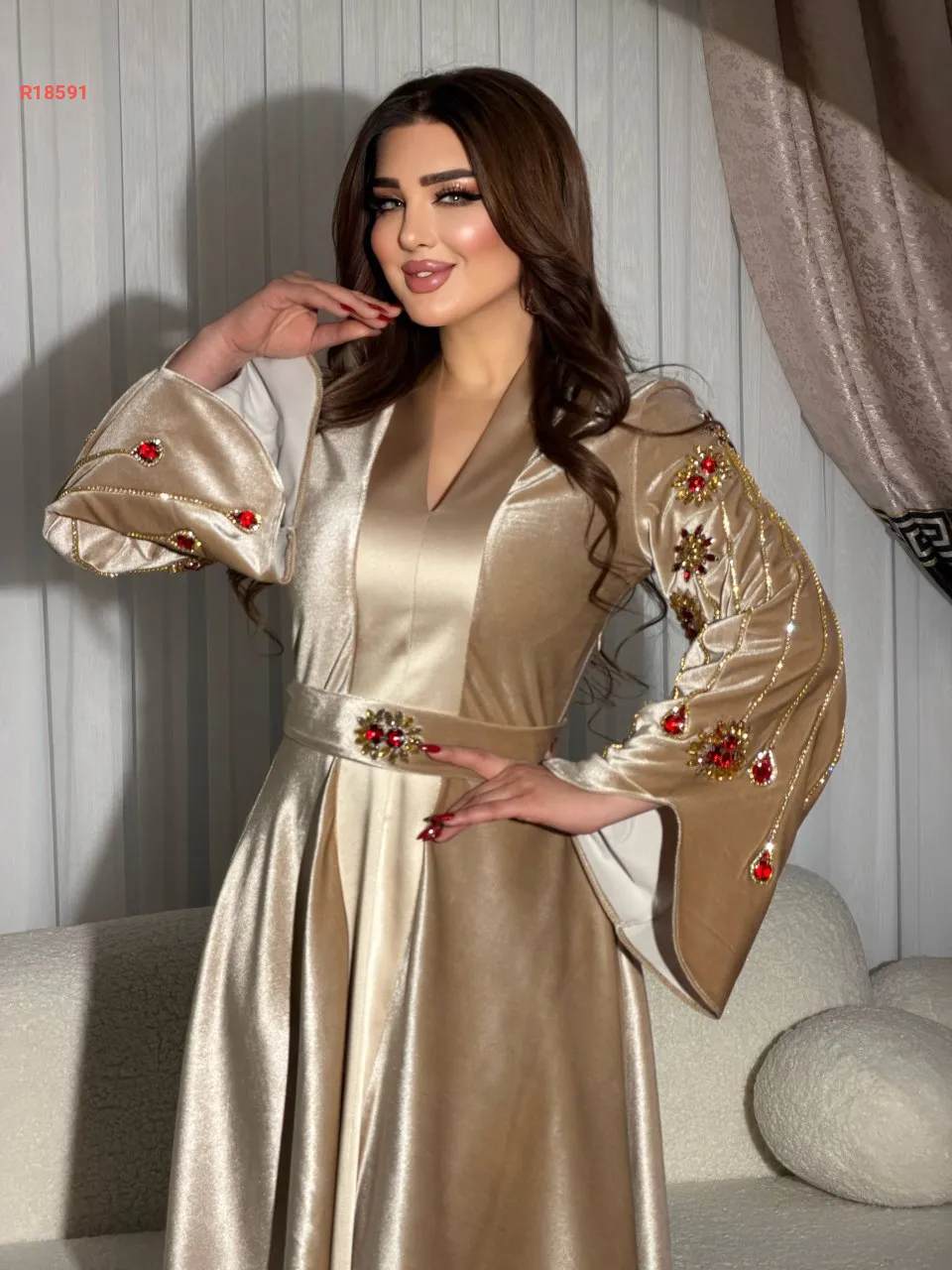 قفطان سادة بأكمام واسعة مع خطوط ألماس وكريستال وحزام