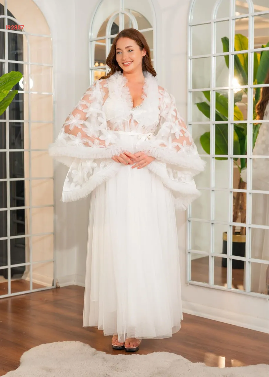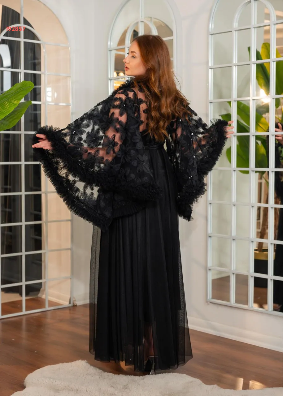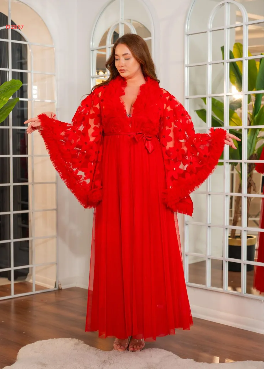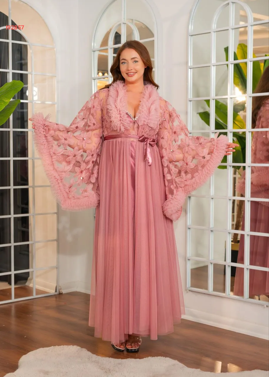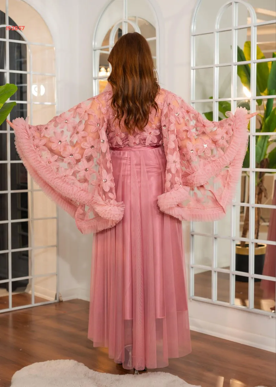 طقم صبحلك طويل ساتان مع أكمام عريضة مرصعة بالكريستال و دانتيل