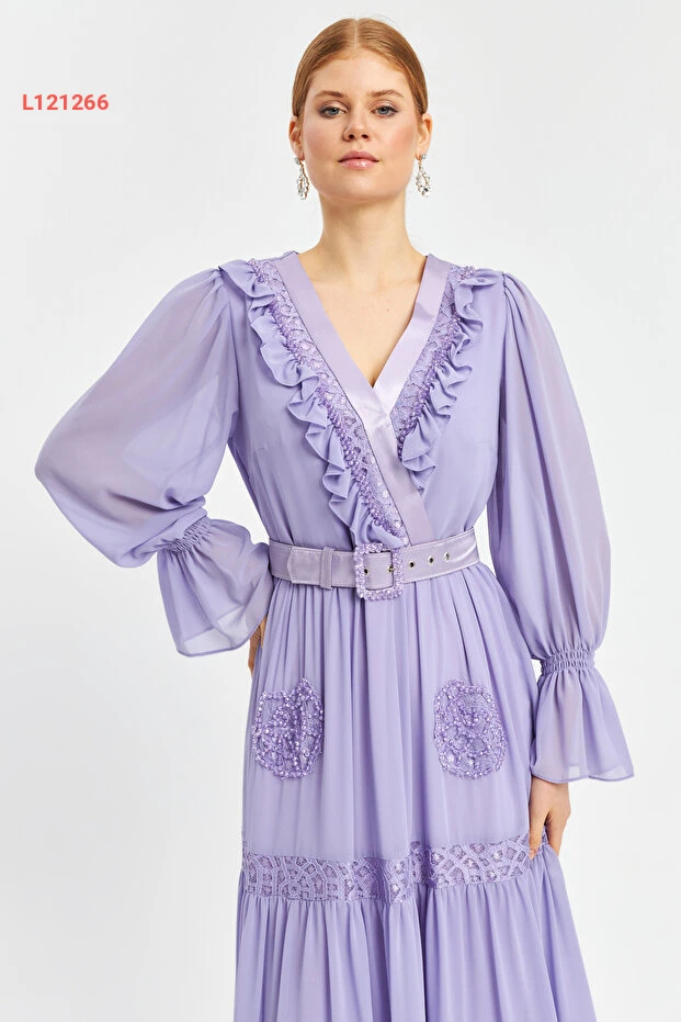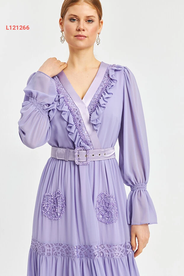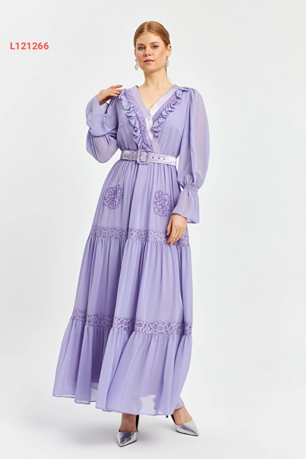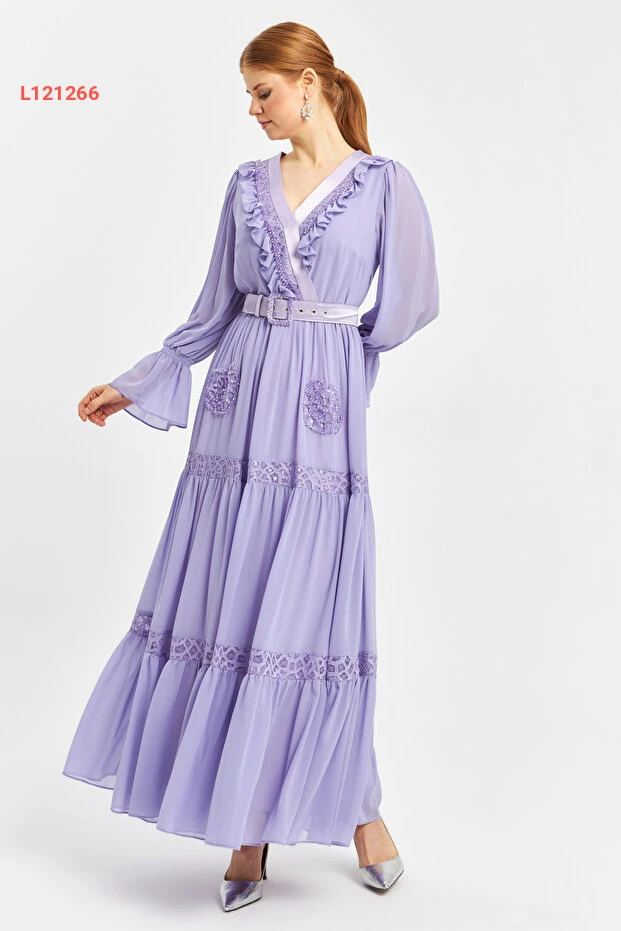 استمتعي بتألّق أنيق لا مثيل له مع فستان الشيفون الطويل المزود بياقة كرووازير ورقائق متلألئة. تتميز التصميمات الدقيقة بالتفاصيل المنسوجة والفُرْفُرَات الجذابة، مما يضمن لكِ إطلالة ساحرة ومتميزة في أي مناسبة خاصة. ارتدي هذا الفستان الأنيق لتكوني محط الأنظار في كل لحظة!