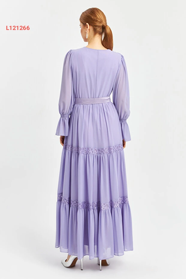 فستان شيفون طويل بأكمام محبوكة بياقة عابرة وزينة فاخرة