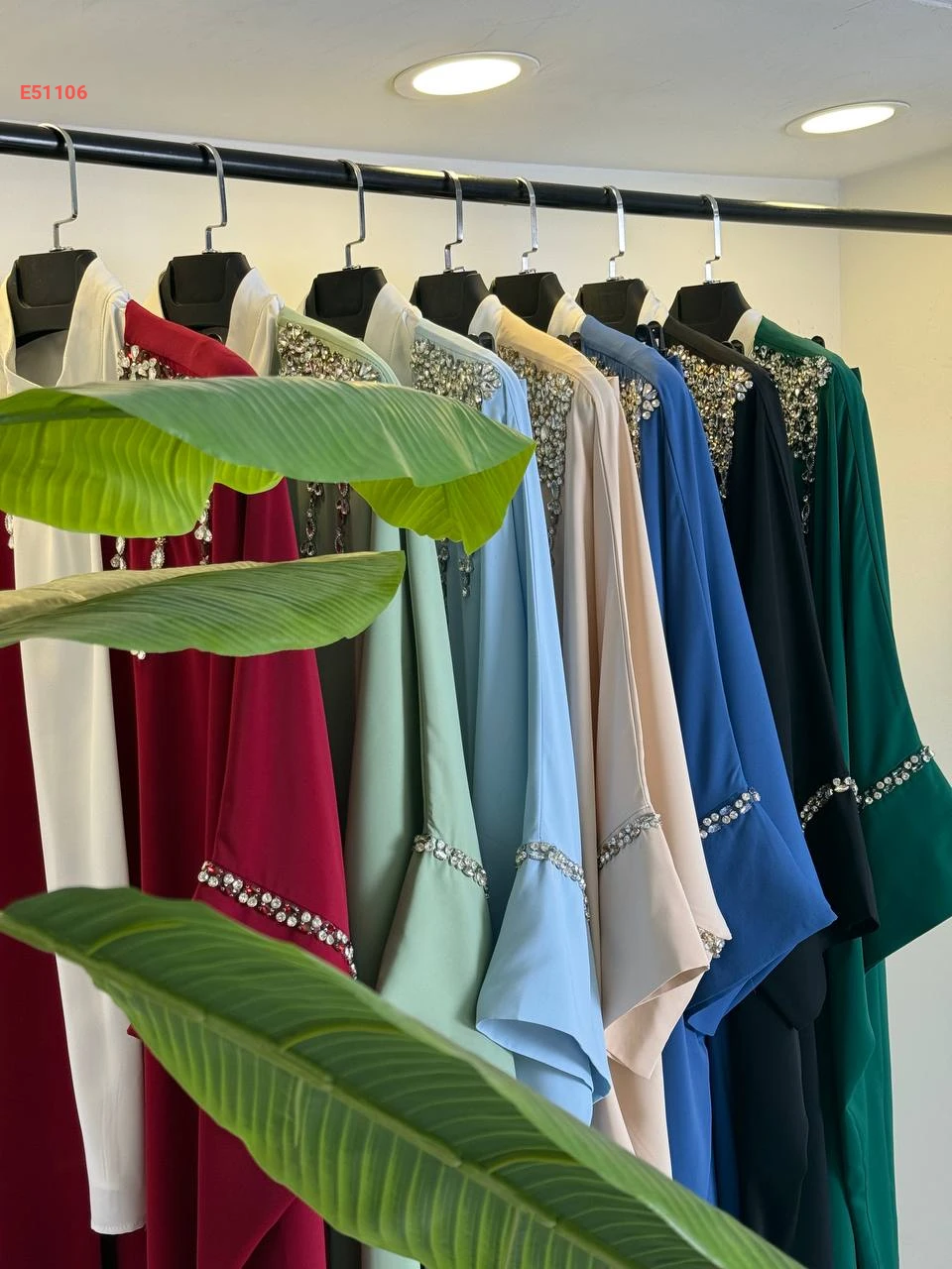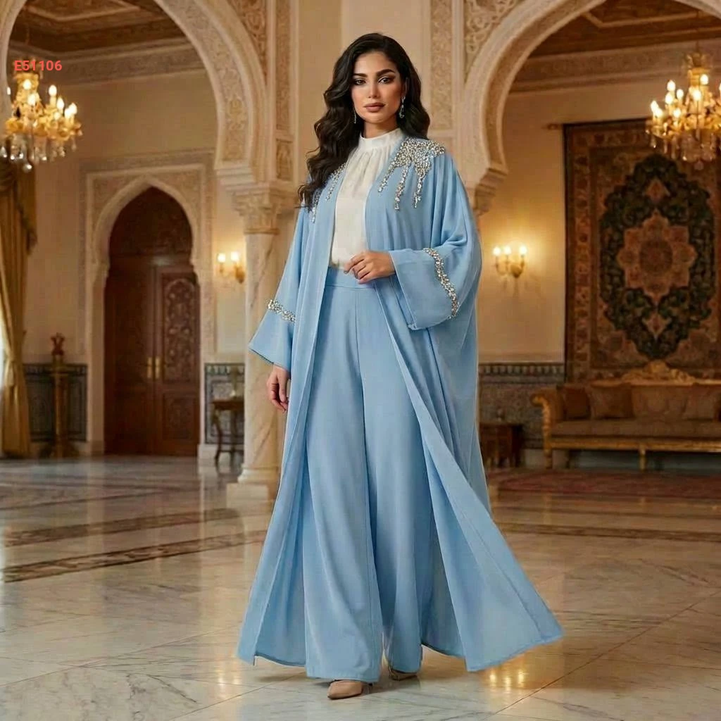 طقم عباية 3 قطع مزين بالكريستال عند الصدر و الأكمام مع بلوزة بياقة مرتفعة وبنطال كلاسيكي