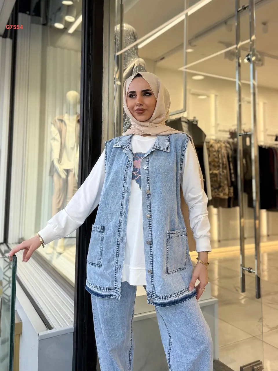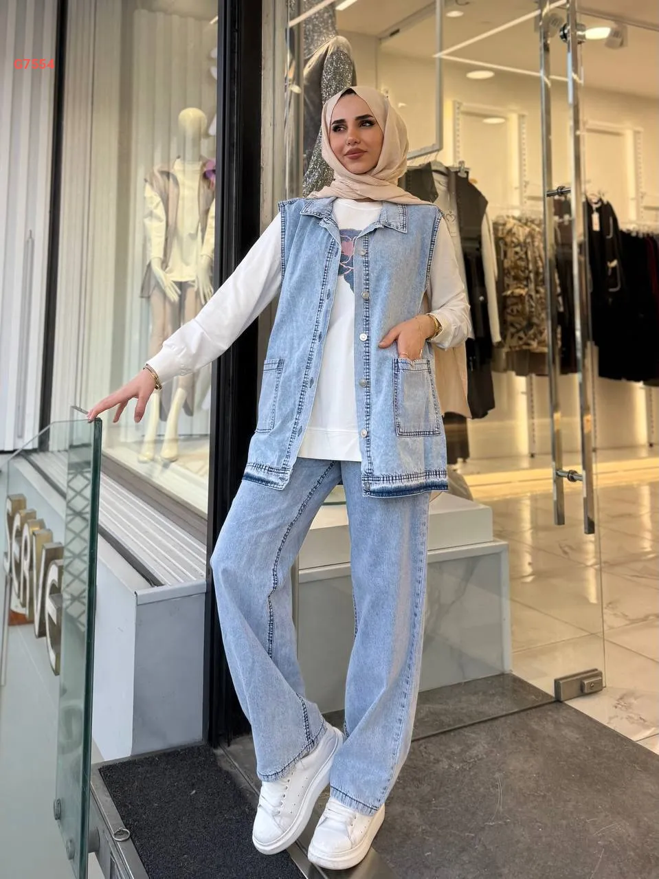 طقم بنطال جينز 3 قطع بأزرار، جيب عريضة