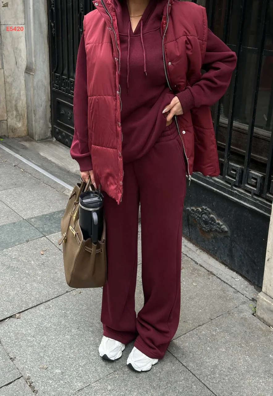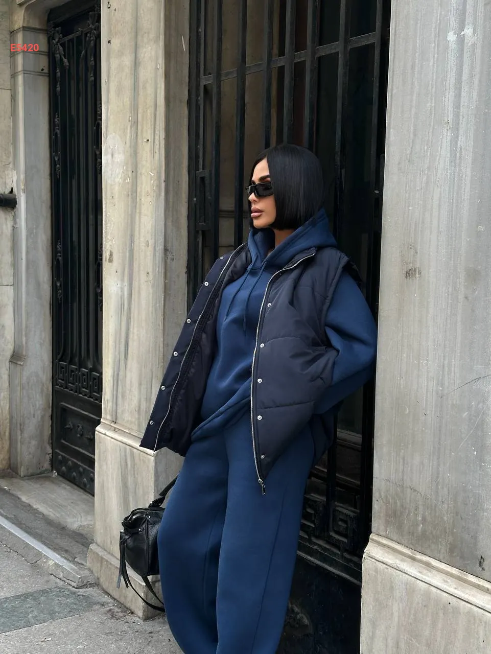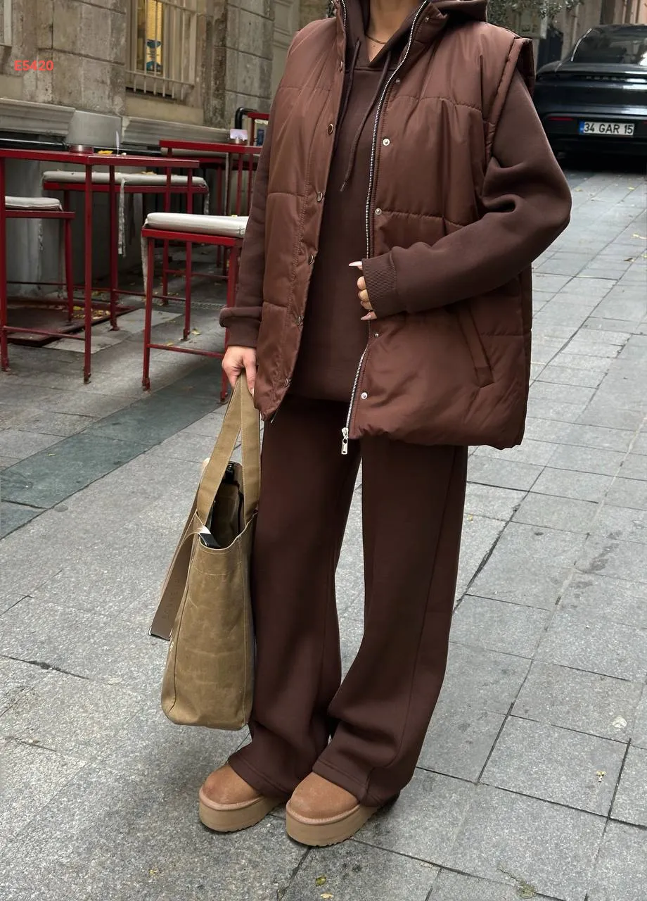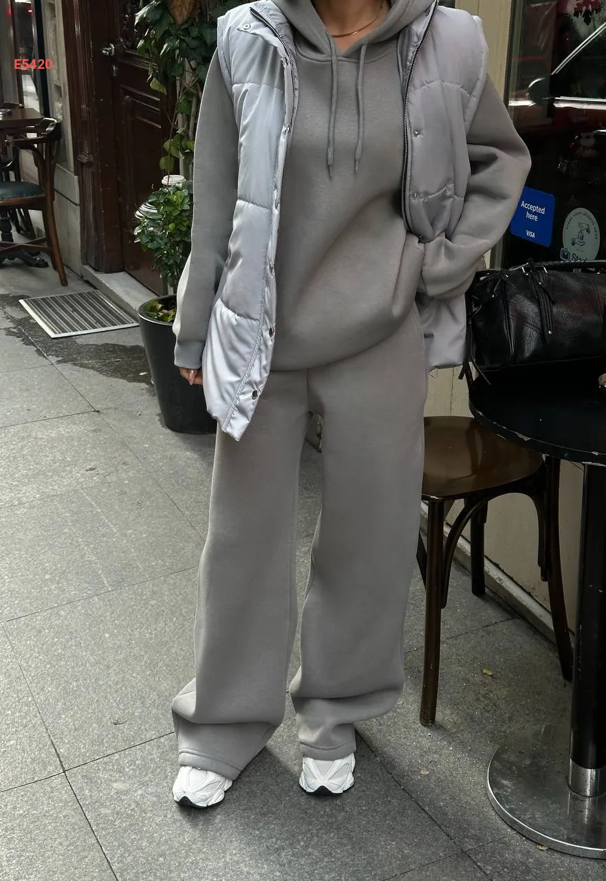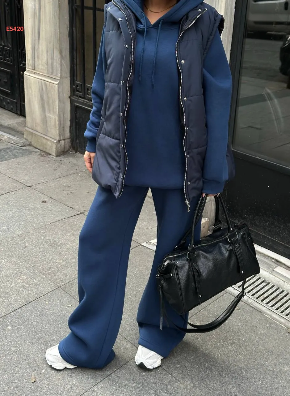 بيجامة 3 قطع فيست سادة ، بسحاب مخفي مع ازرار كببس وجيب ، وغطاء رأس