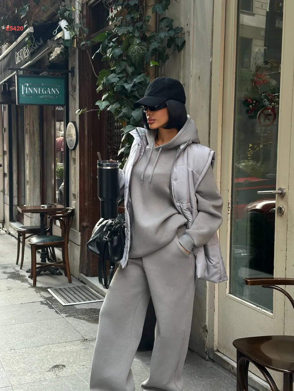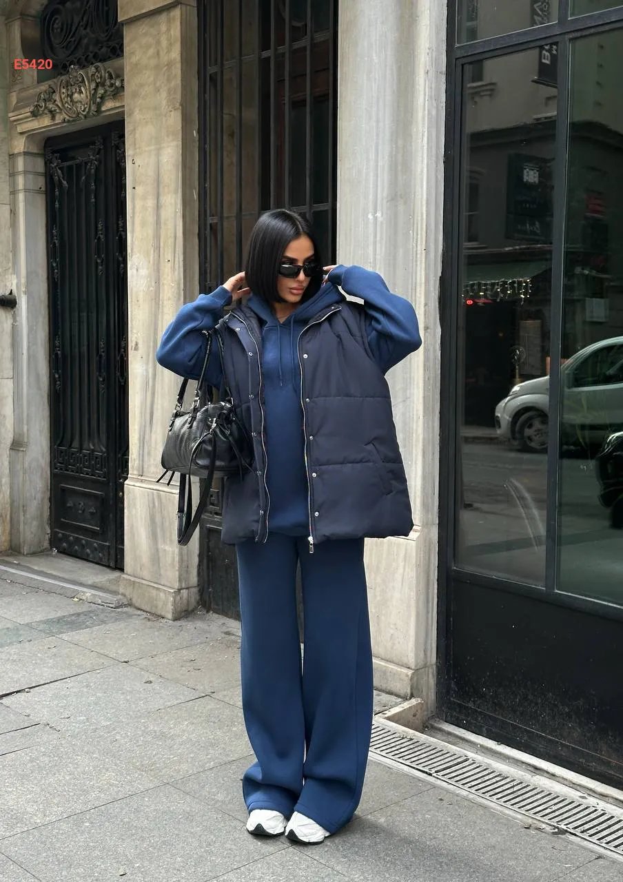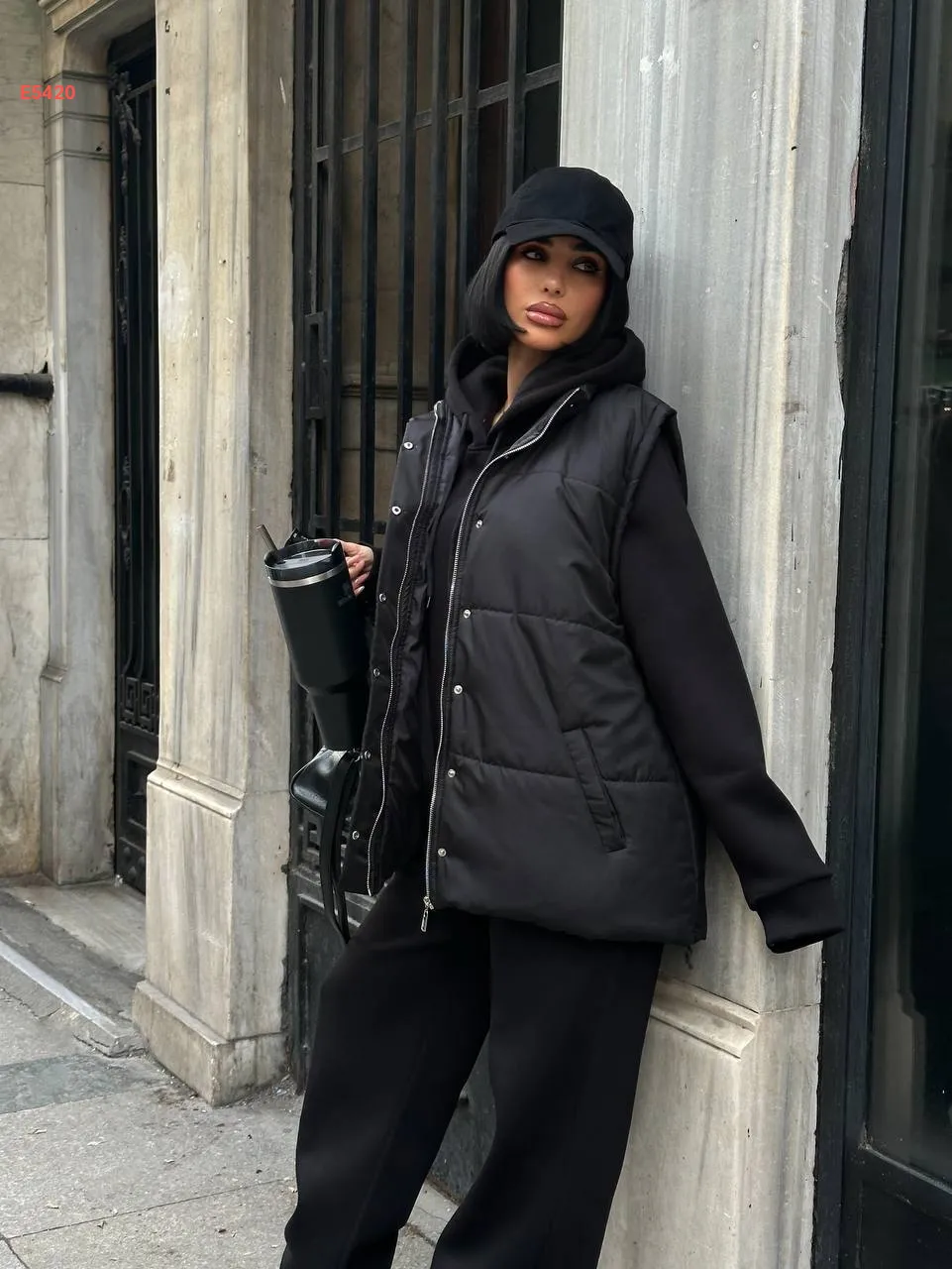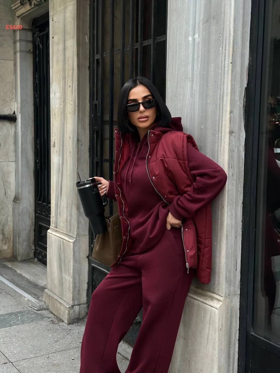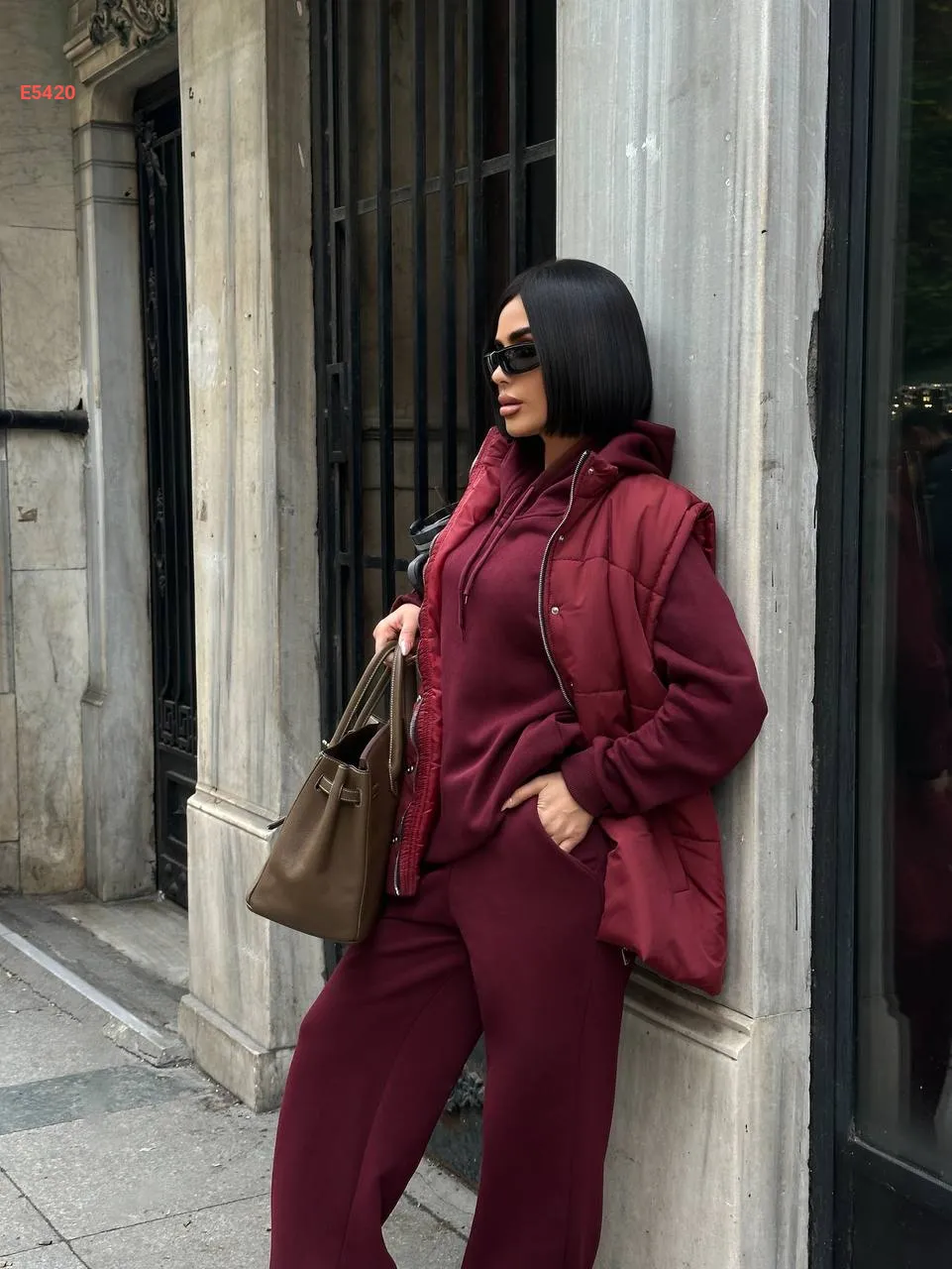 بيجامة 3 قطع فيست سادة ، بسحاب مخفي مع ازرار كببس وجيب ، وغطاء رأس