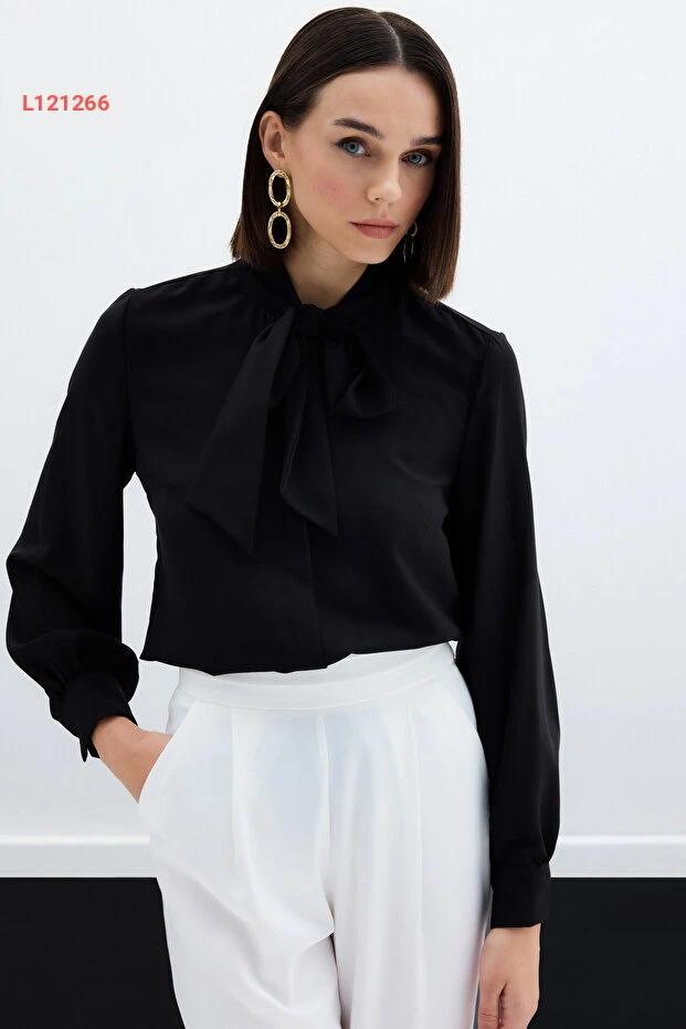 استمتع بأناقة خالدة مع قميص ساتين ذو ياقة قابلة للإغلاق بالرباط باللون الأسود. صنعت هذه القطعة من قماش عالي الجودة يمنحك راحة طوال اليوم، بينما يضفي تصميمها الأنيق لمسة من الفخامة على إطلالتك. مثالي للمناسبات الرسمية وغير الرسمية، سيصبح هذا القميص أساسياً في خزانتك.