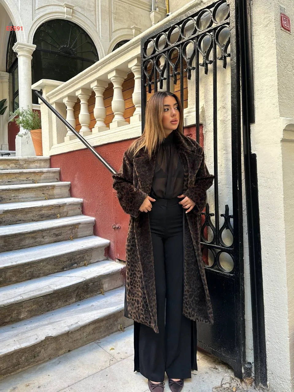 معطف طويل منقوش تايغر بحزام جلد