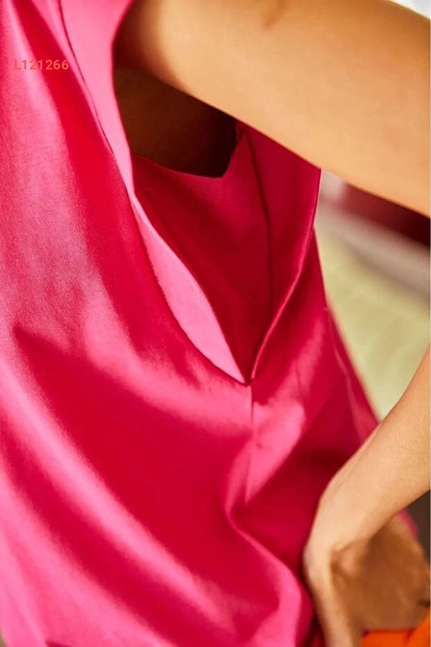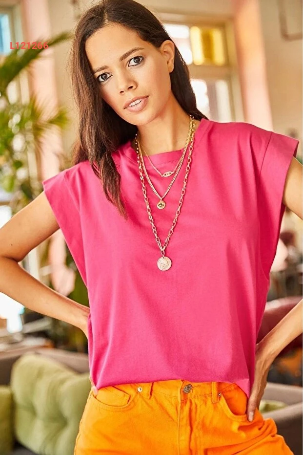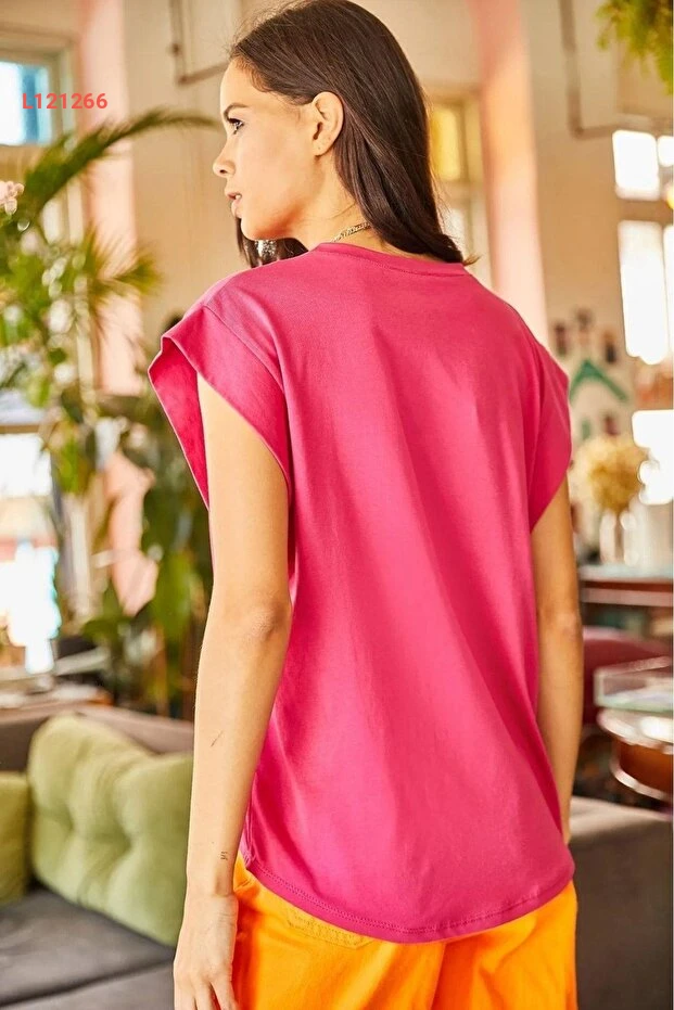 تي شيرت أساسي ضيق للسيدات بنمط فوشيا من قطن 100% مع تصميم مزدوج