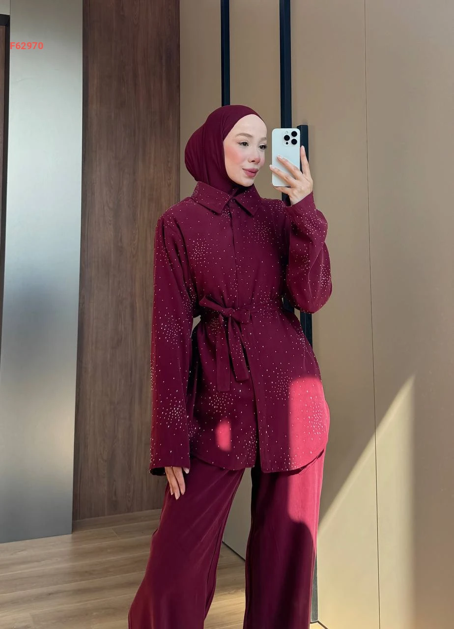 طقم بنطال قطعتين بأزرار مزين بستراس ناعم مع حزام