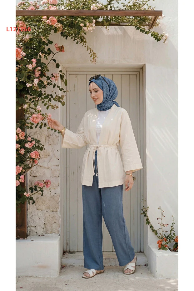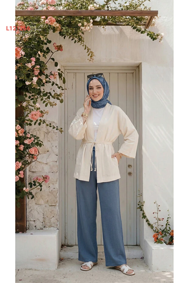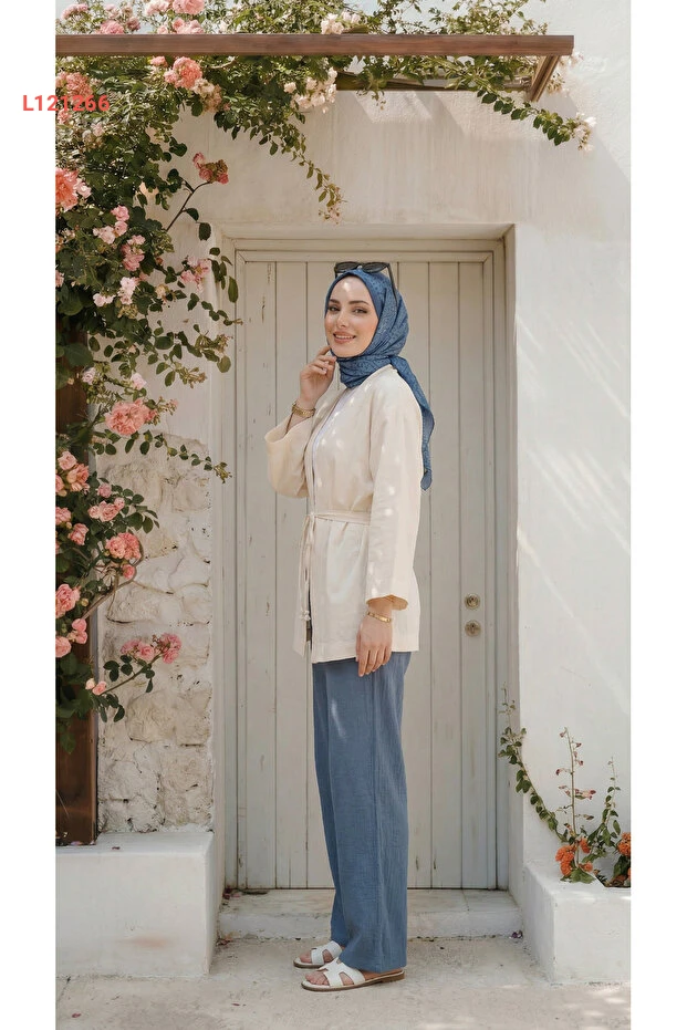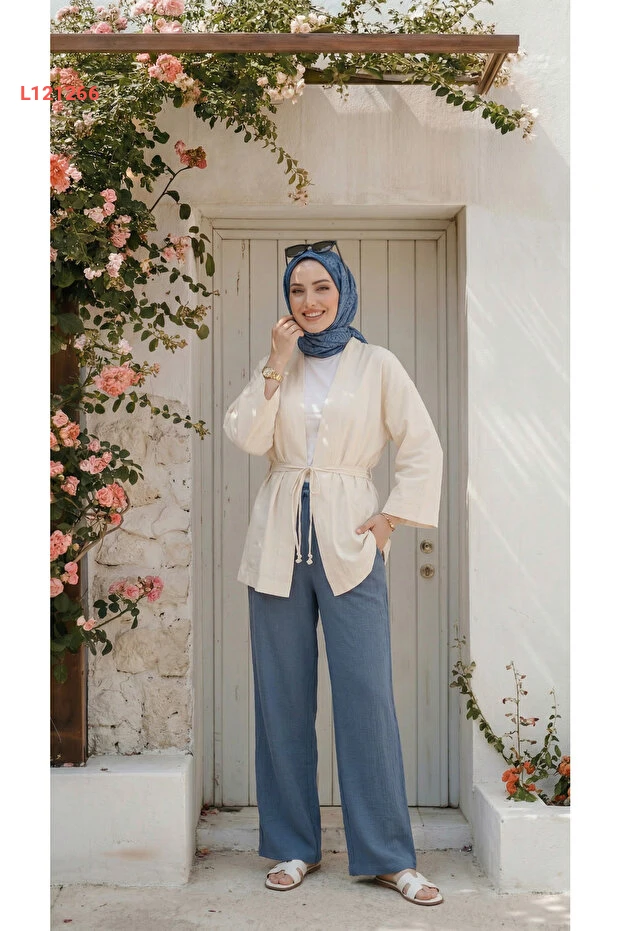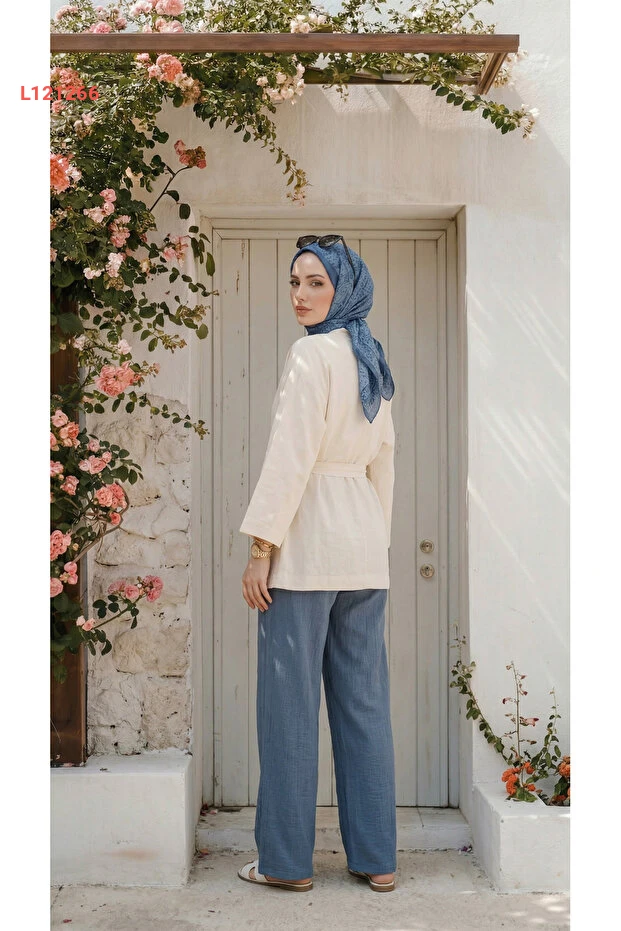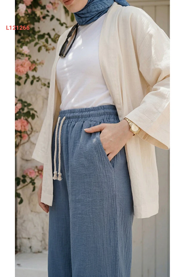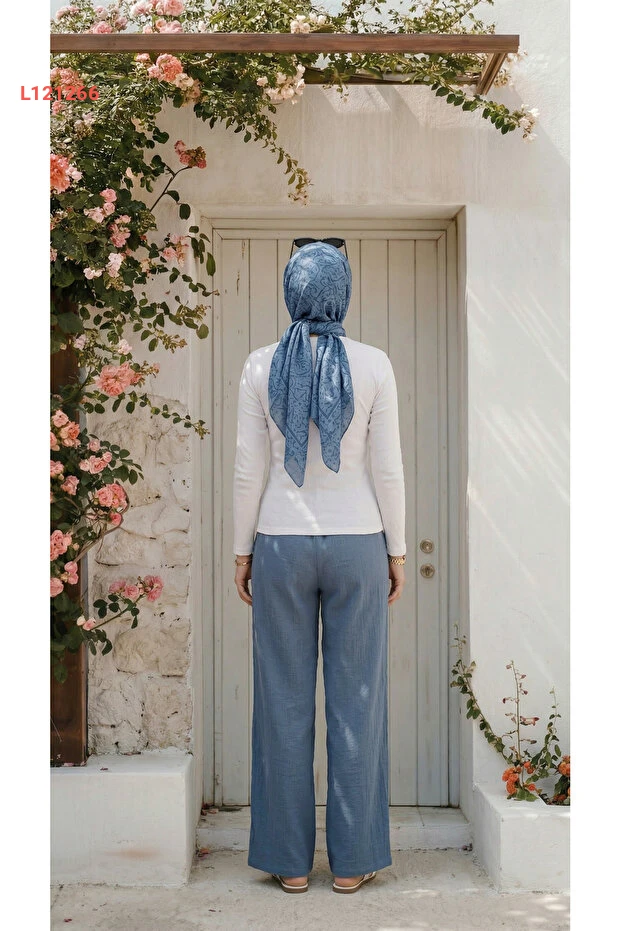 بنطال واسع للنساء من كتان تركوازي بلمسة ستايل محتشم