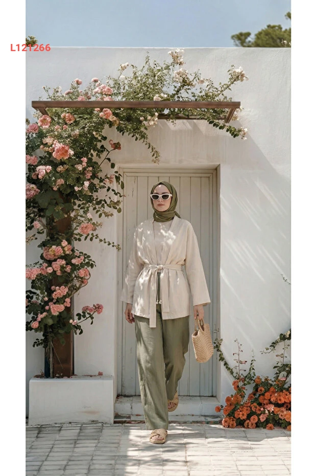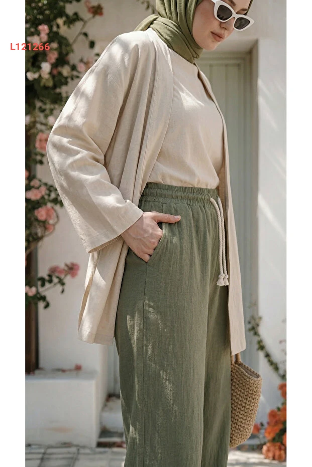 بنطلون بالازو نسائي كاكي من الكتان - مناسب للمحتشمات، واسع وغير شفاف
