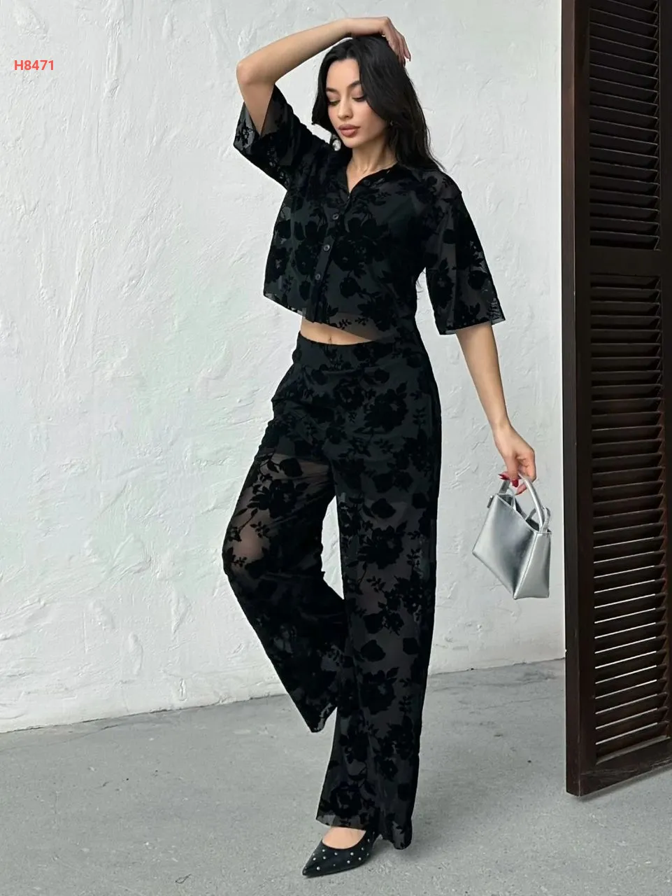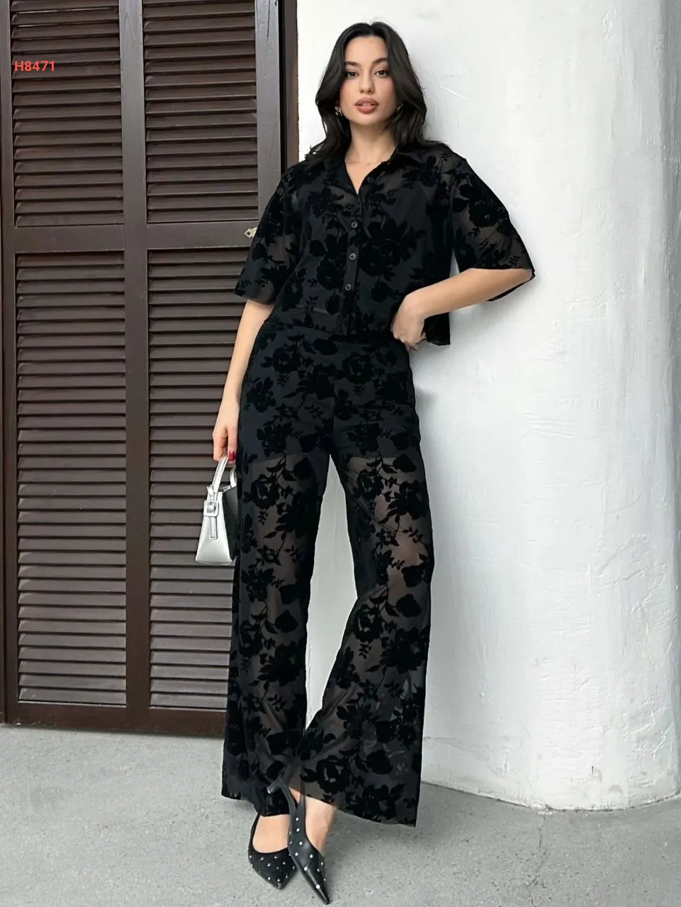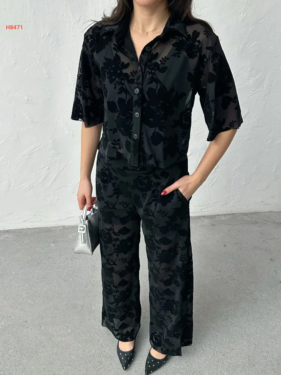 طقم بنطال شفاف منقوش مع قميص