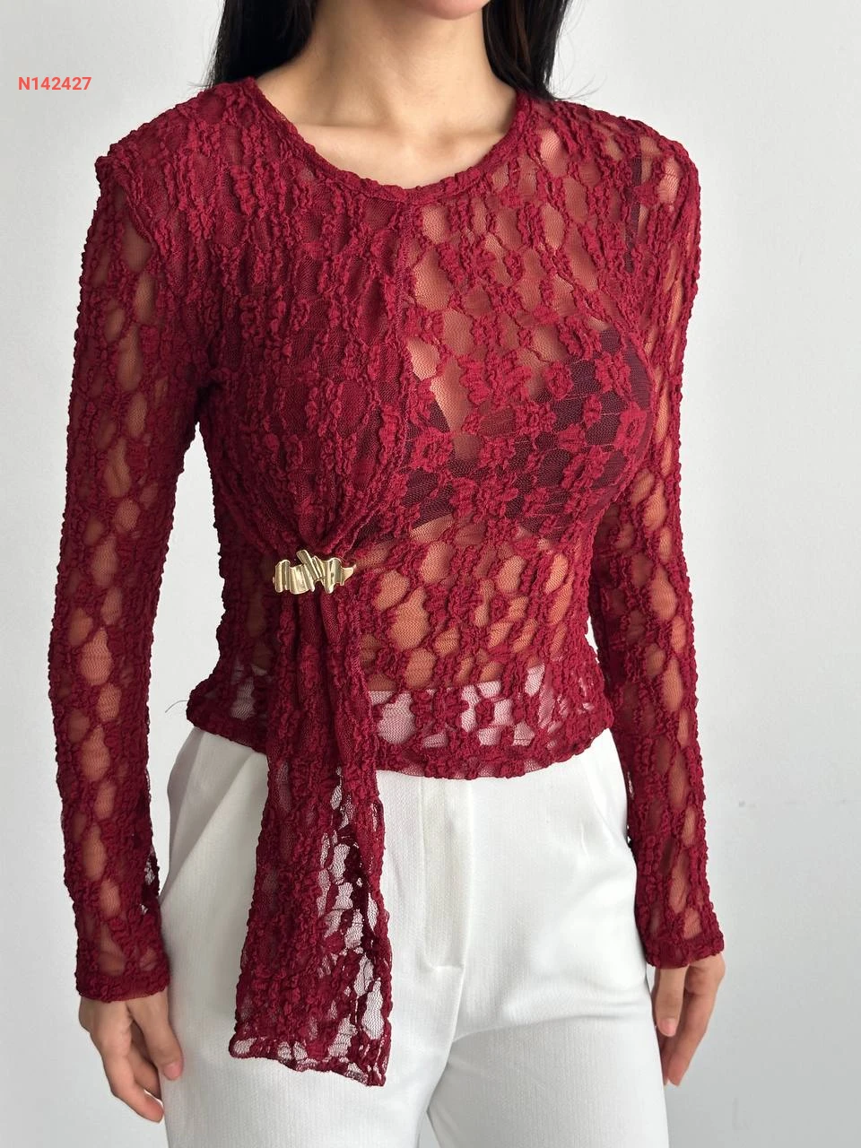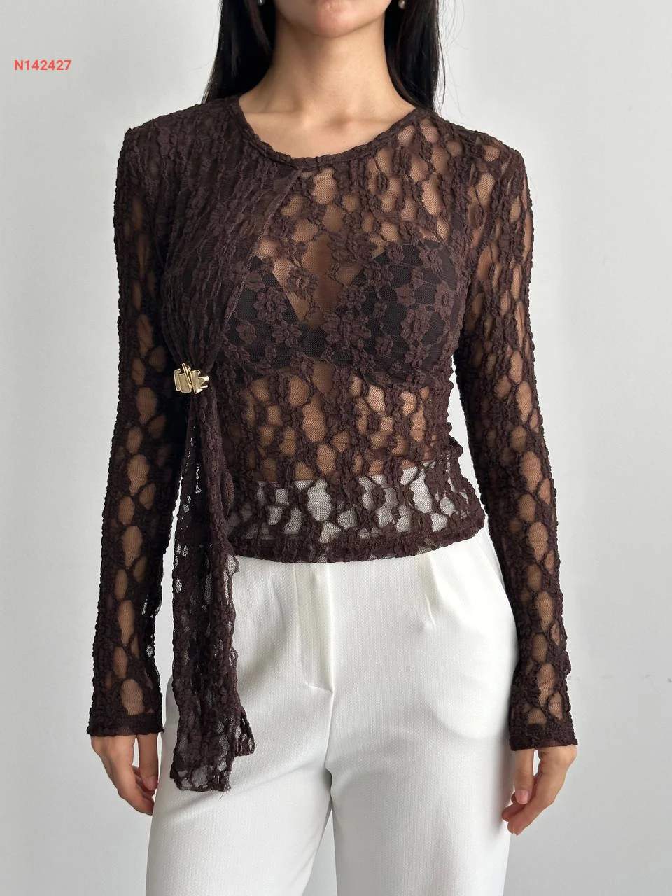 بلوزة تول شفافة مع بروش دهبي