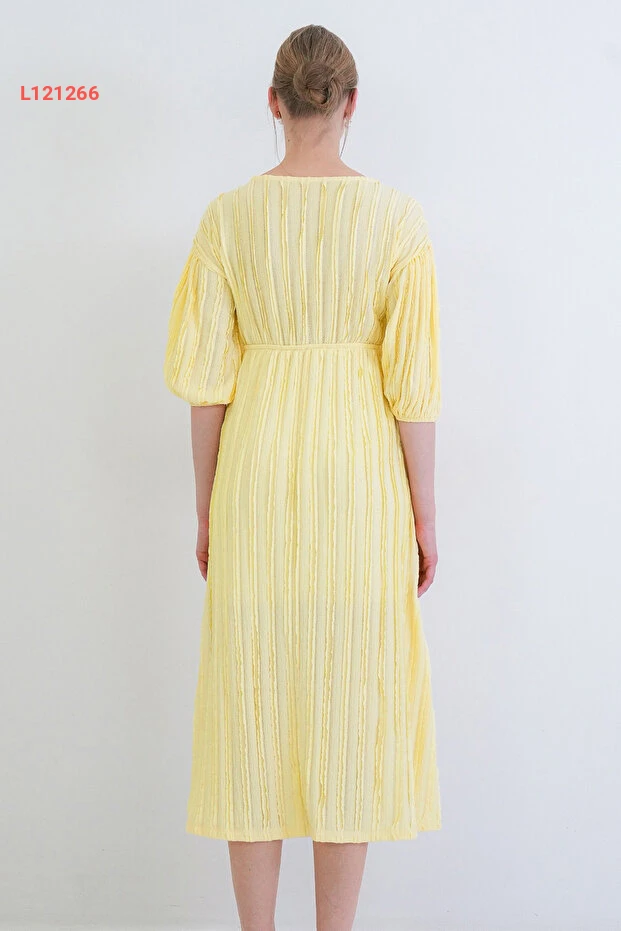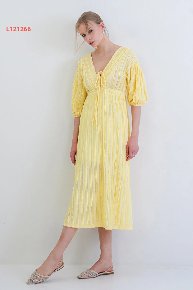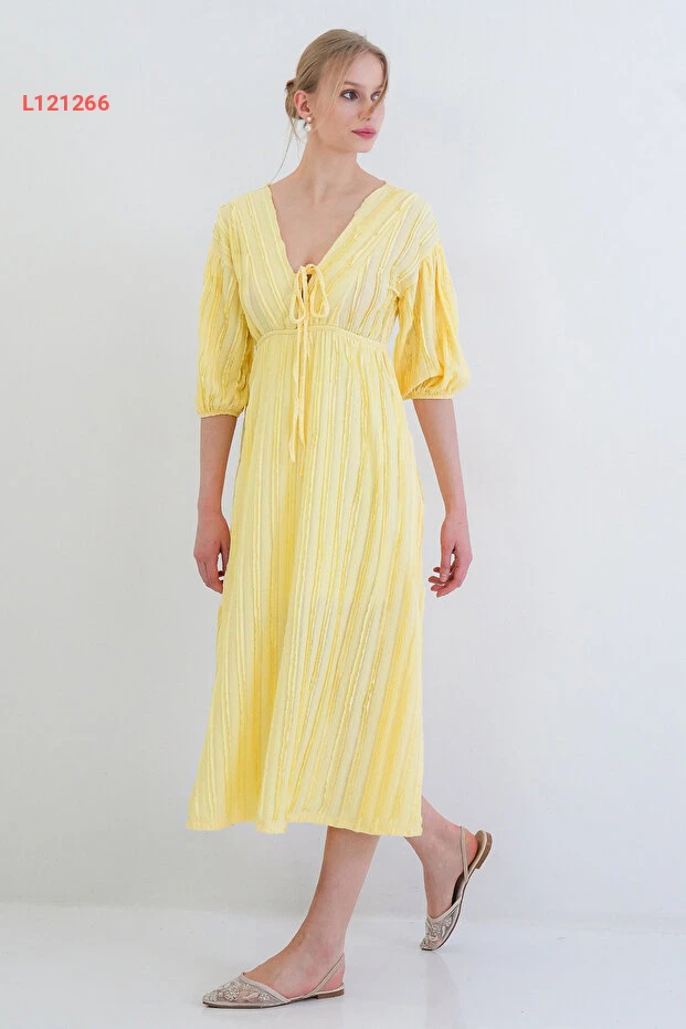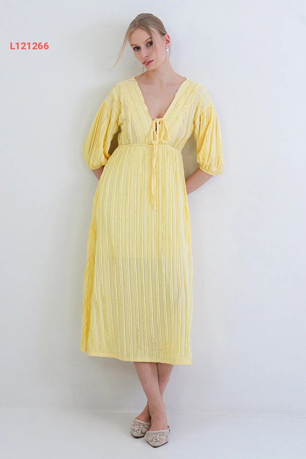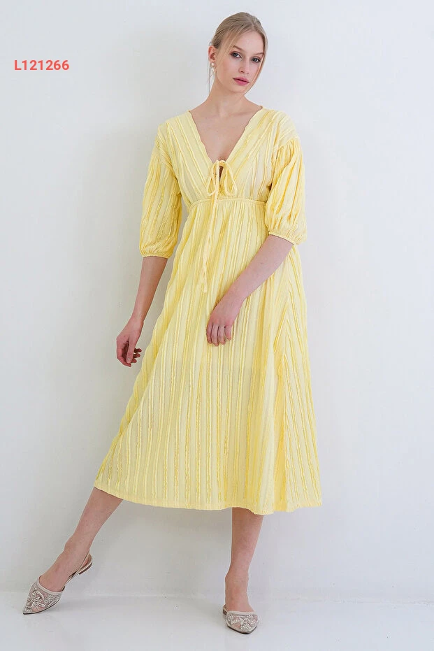 Trend Alaçatı Stili Sarı V Yaka Bağlama Detaylı Fırfır Kumaş Maxi Boy Elbise عالي الجودة. مثالي للاستخدام اليومي مع متانة وتصميم ممتاز.