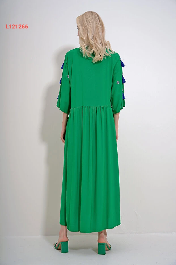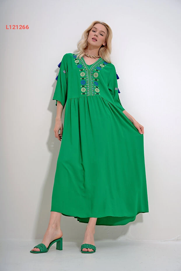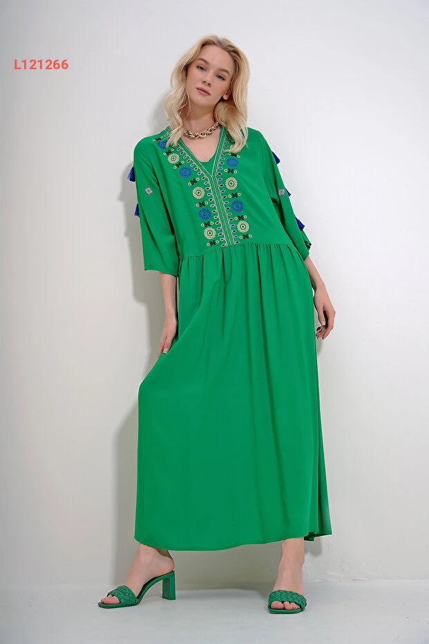فستان مطرز بتفاصيل شرابة بتصميم Alaçatı باللون الأخضر