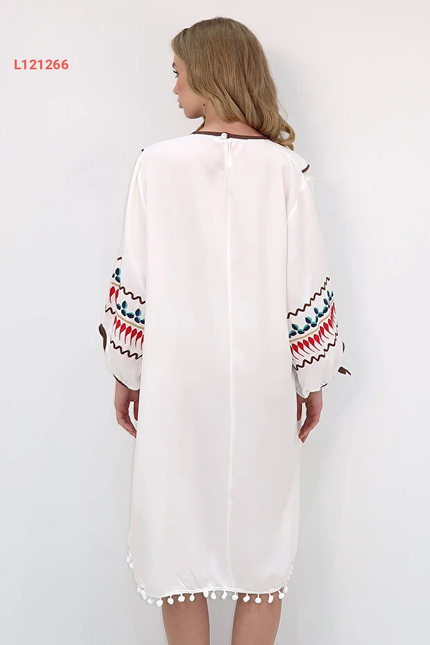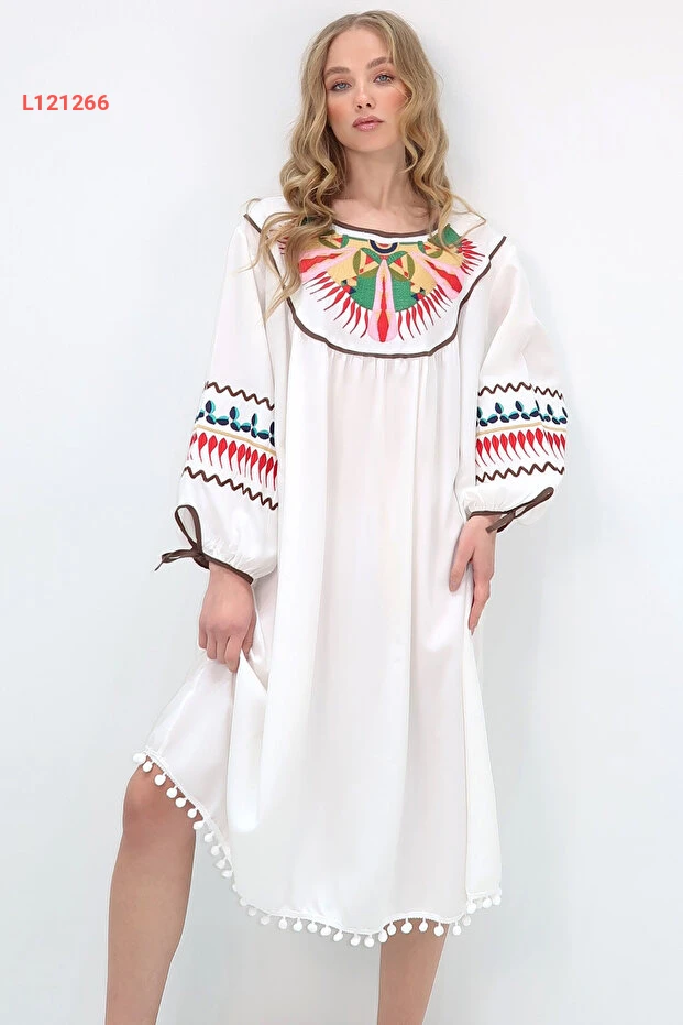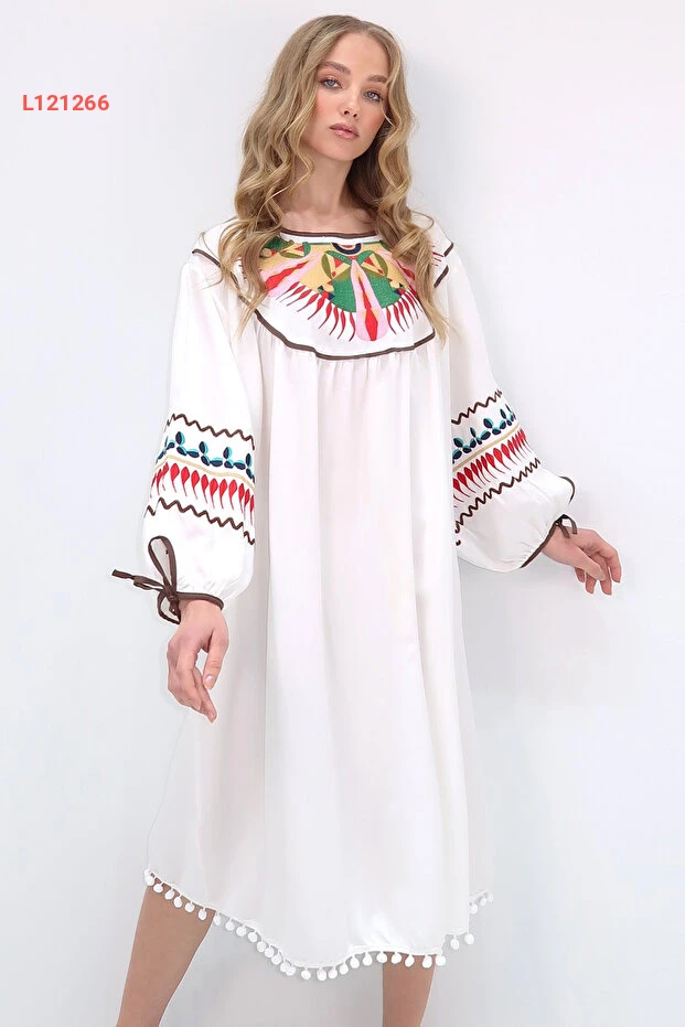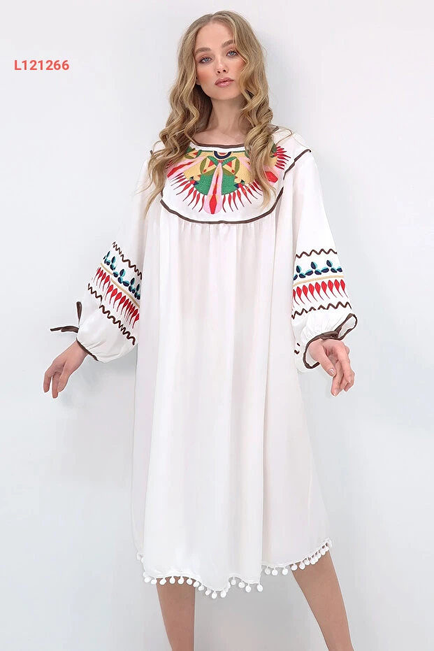 فستان ماكسي بستايل آلاجاتي مع ياقة دائرية وتطريز عرقي بلون البيج