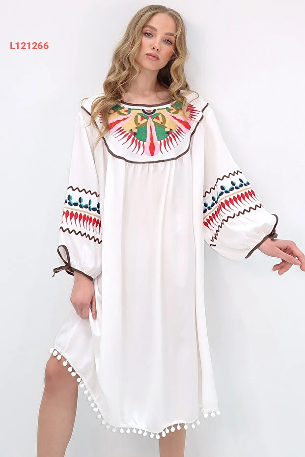 استمتعي بإطلالة مميزة مع فستان Trend Alaçatı Stili بلونه الإكروي وجزئه العلوي بتصميم بيسكليت وزخارف إتنيك رائعة. يجمع هذا الفستان بين الأناقة والراحة، مما يجعله الخيار المثالي لمناسباتك الصيفية وجلساتك الاسترخائية على الشاطئ. تميزي بتفاصيله الراقية وطوله المثالي الذي يبرز أنوثتك وجمالك.