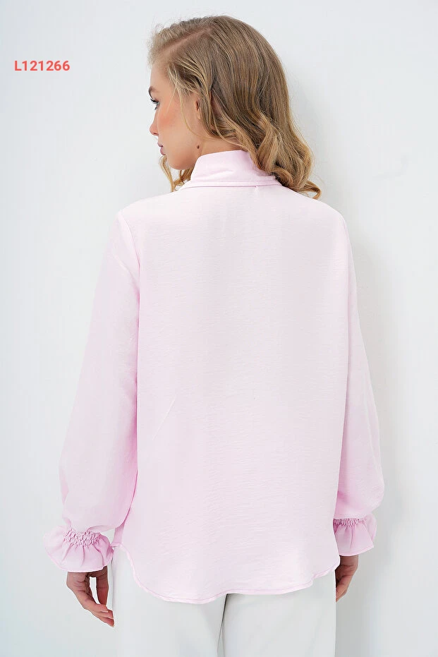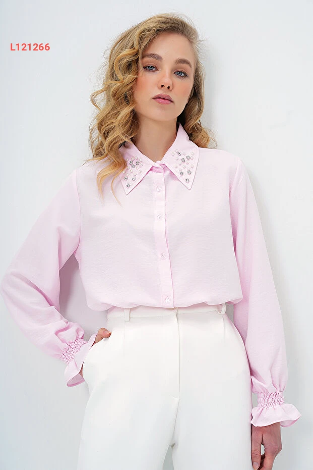 قميص بأكمام Aerobin مزين باللؤلؤ والخرز بتصميم Alaçatı الوردي