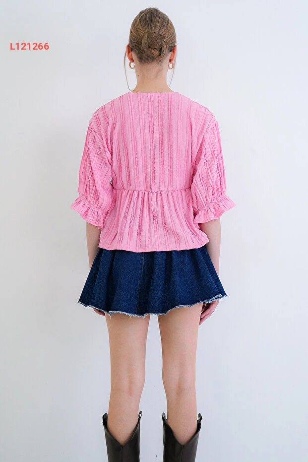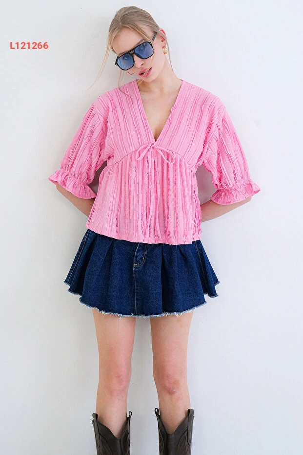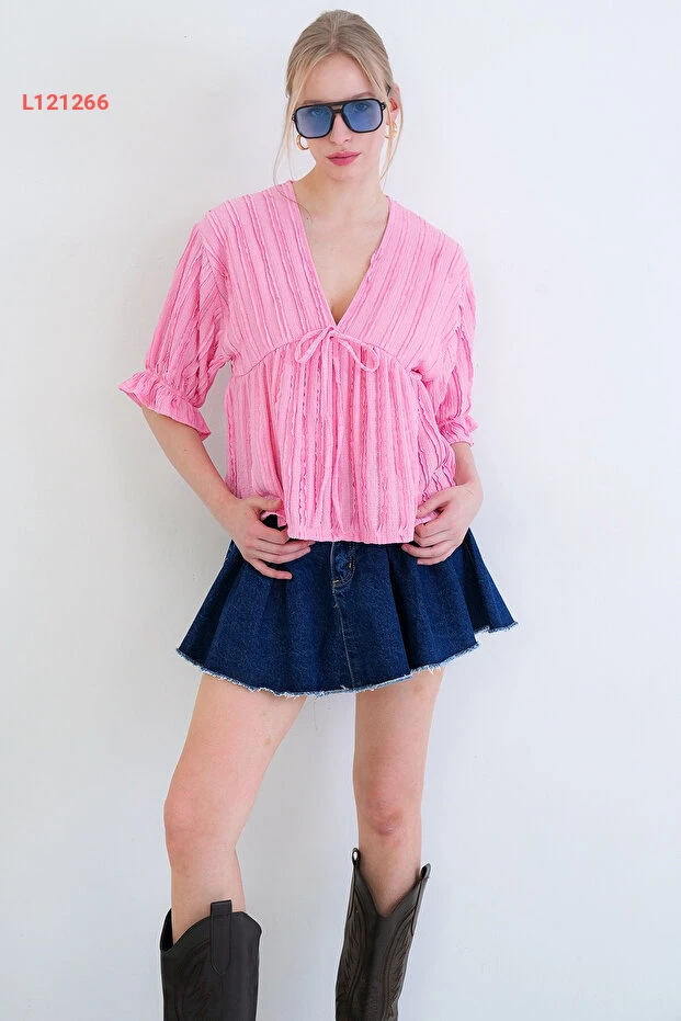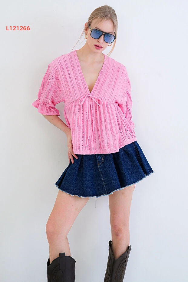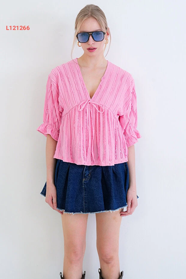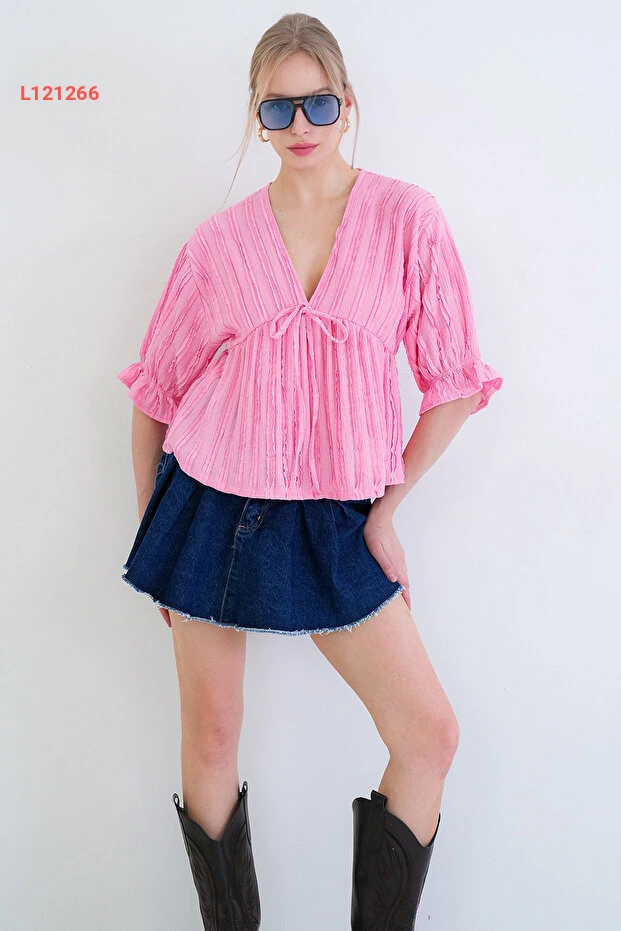 استمتعي بإطلالة مميزة مع بلوزة "Trend Alaçatı" الرائعة، التي تأتي بتصميم V يضفي لمسة أنيقة وجذابة. صُممت من قماش فرفور خفيف ومريح، وتتميز بأكمام ثلاثية الطول مع أساك فخمة تضيف لمسة من الأنوثة. مثالية للارتداء اليومي أو في المناسبات، ستجعل هذه البلوزة كل يوم يحمل لمسة من التميز.