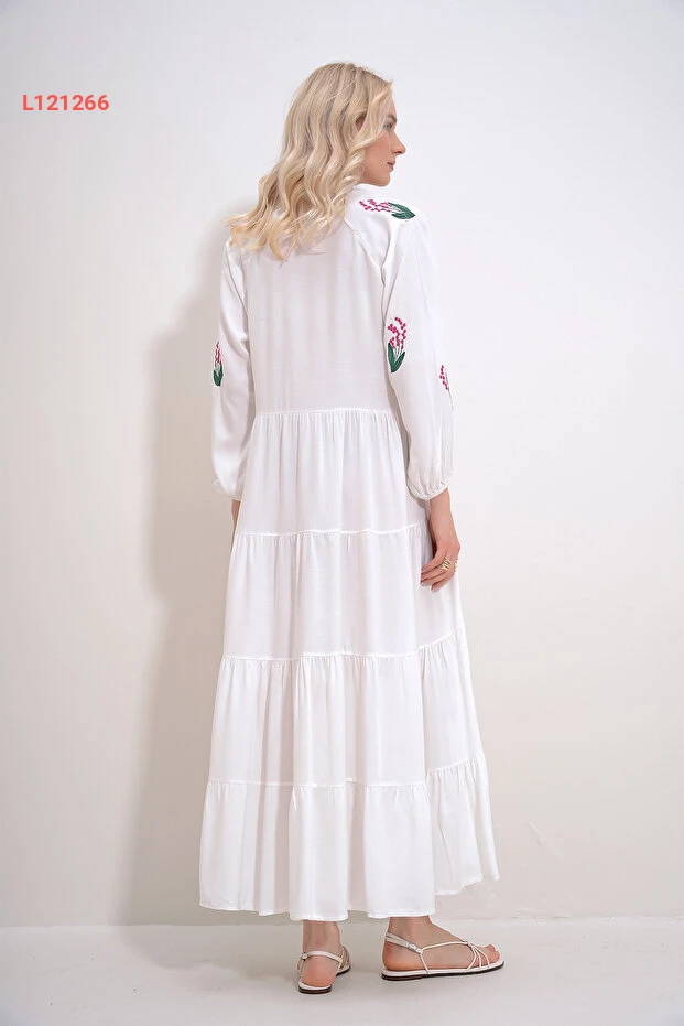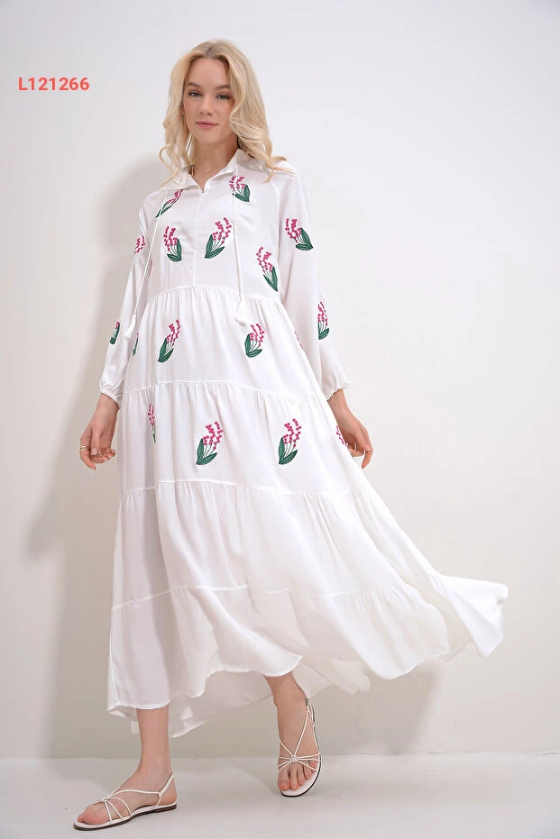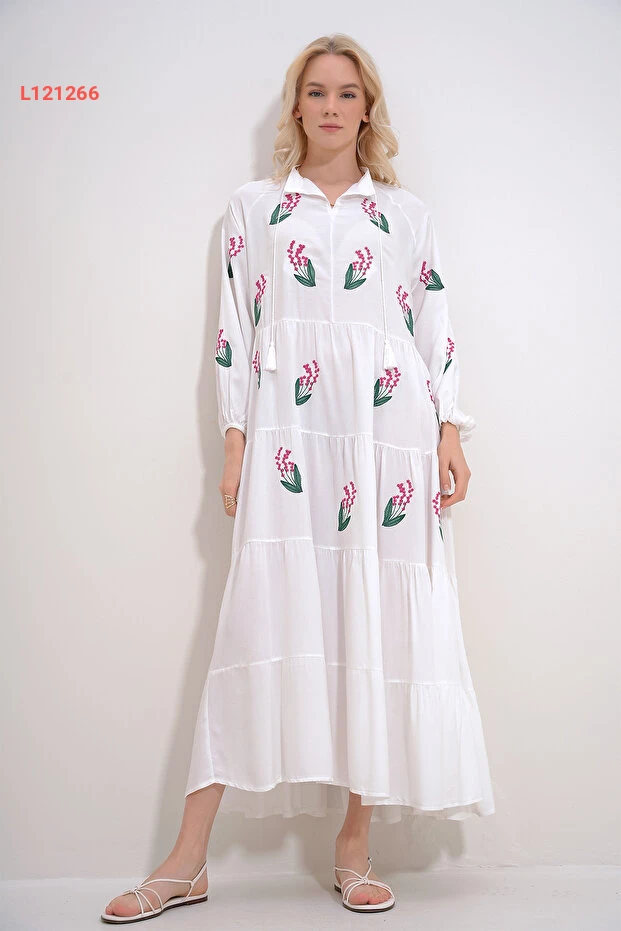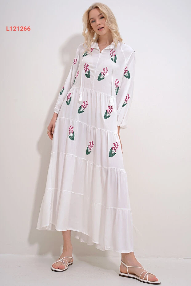فستان دوكمة بيضاء بتصميم آلاجاتي مزين بقبّة حاكمة وكسرات متتالية