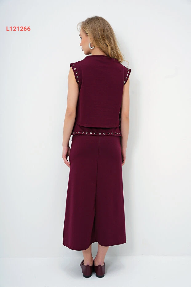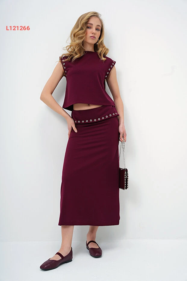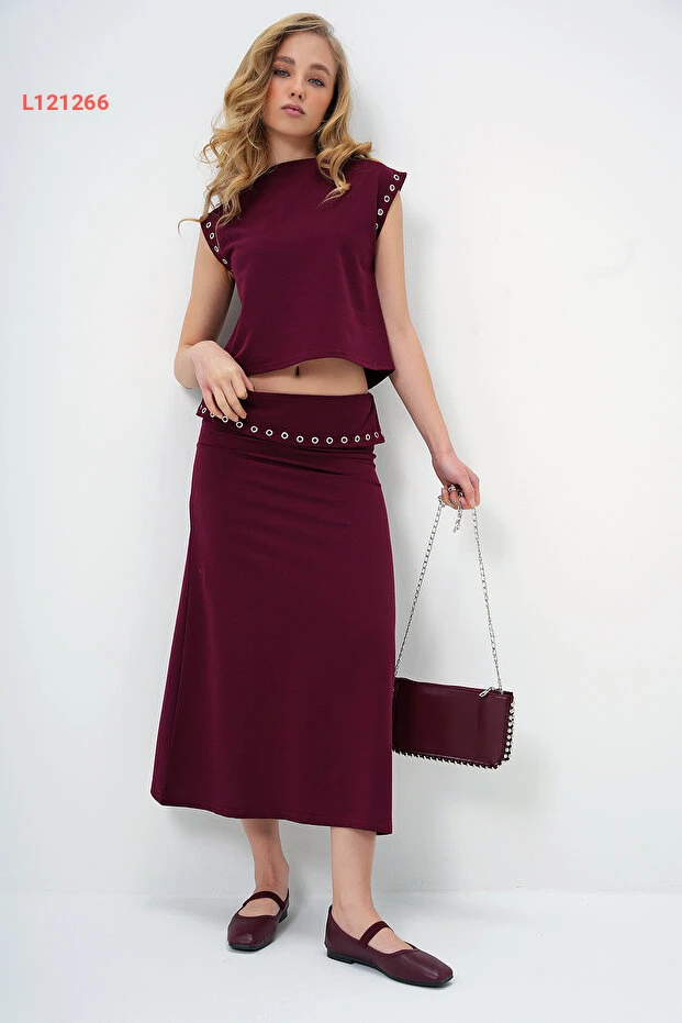 بلوزة تنورة بتصميم Alaçatı الأنيق باللون bordo مع ياقة مرفوعة