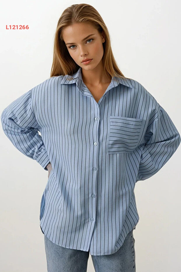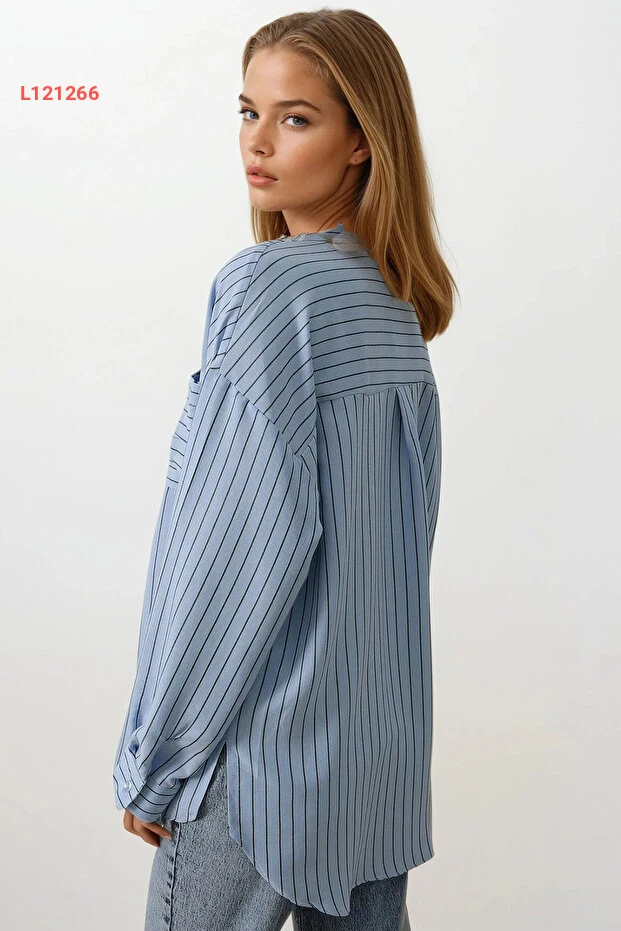 قميص نسائي واسع بياقة ستايل ألاجاتي باللون الأزرق الفاتح مع خطوط