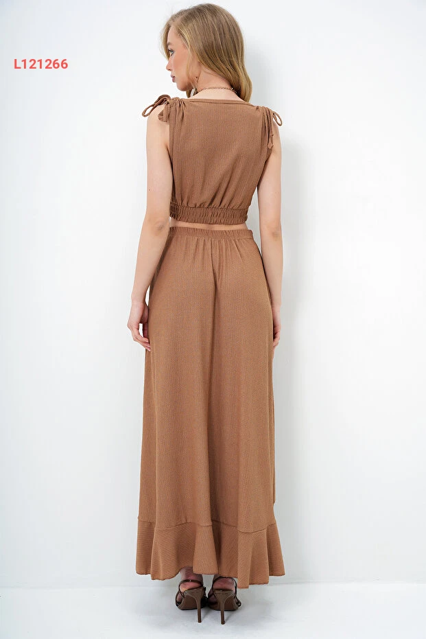 بلوزة قصيرة برقبة متقاطعة وتنورة مزخرفة بأسلوب صيفي عصري