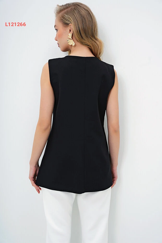 سترة نسائية سوداء بقصّة غير متساوية مع تفاصيل معدنية بأسلوب ألاجاتي