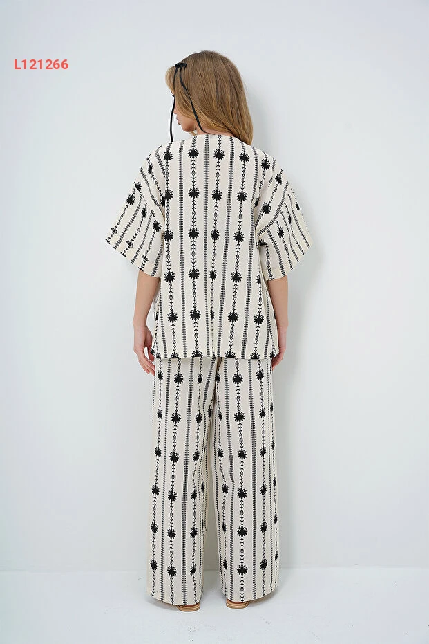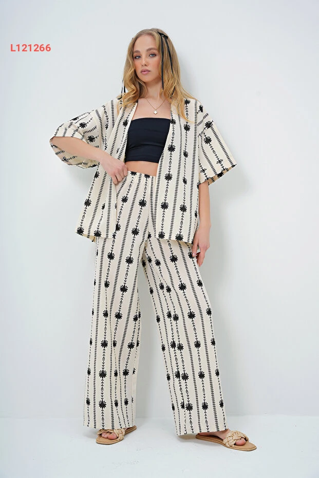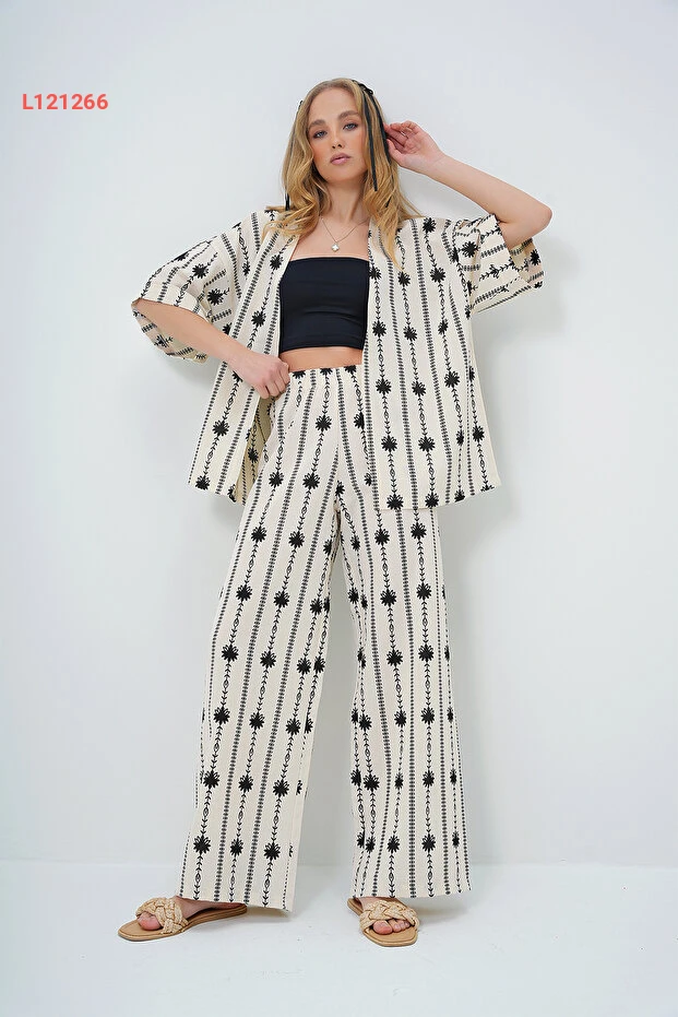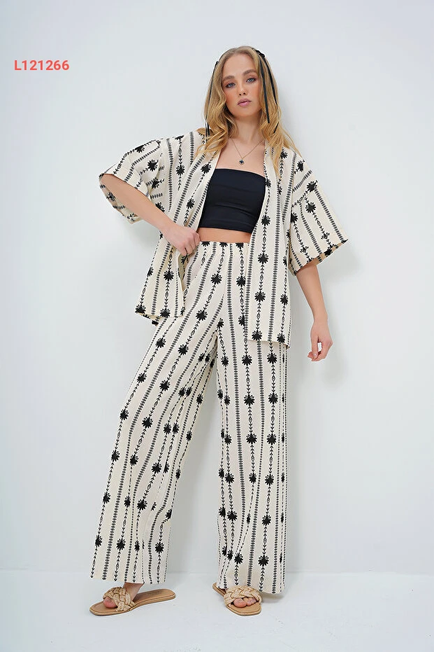 استمتعي بأناقة لا مثيل لها مع طقم "Trend Alaçatı" المكون من كيمونو ذات أكمام مزدوجة وبنطلون بالازو الأسود المزخرف بالأزهار. مصنوعة من أقمشة الكتان الفاخرة، يجمع هذا التصميم بين الراحة والحداثة، مما يجعله الخيار المثالي لمظهر عصري وجذاب يناسب جميع المناسبات. اجذبي الأنظار مع كل خطوة!