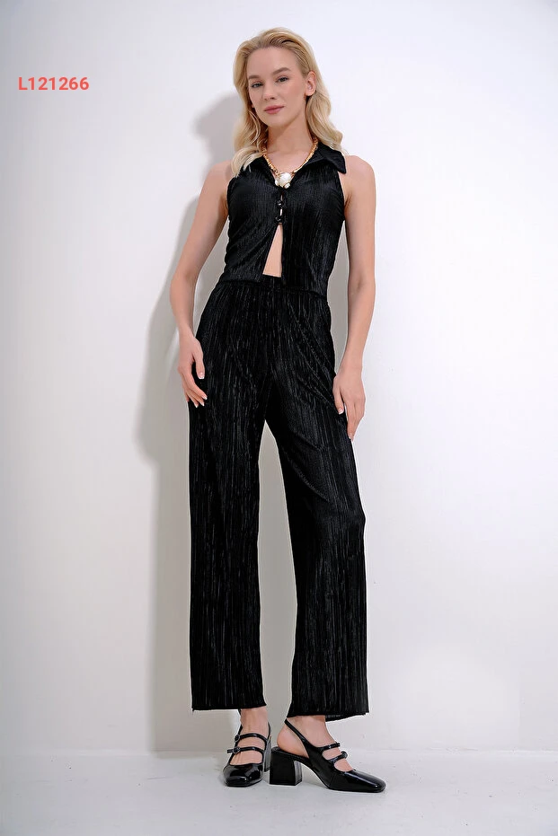 مجموعة نسائية عصرية من قميص بليسيه وسروال بالازو باللون الأسود