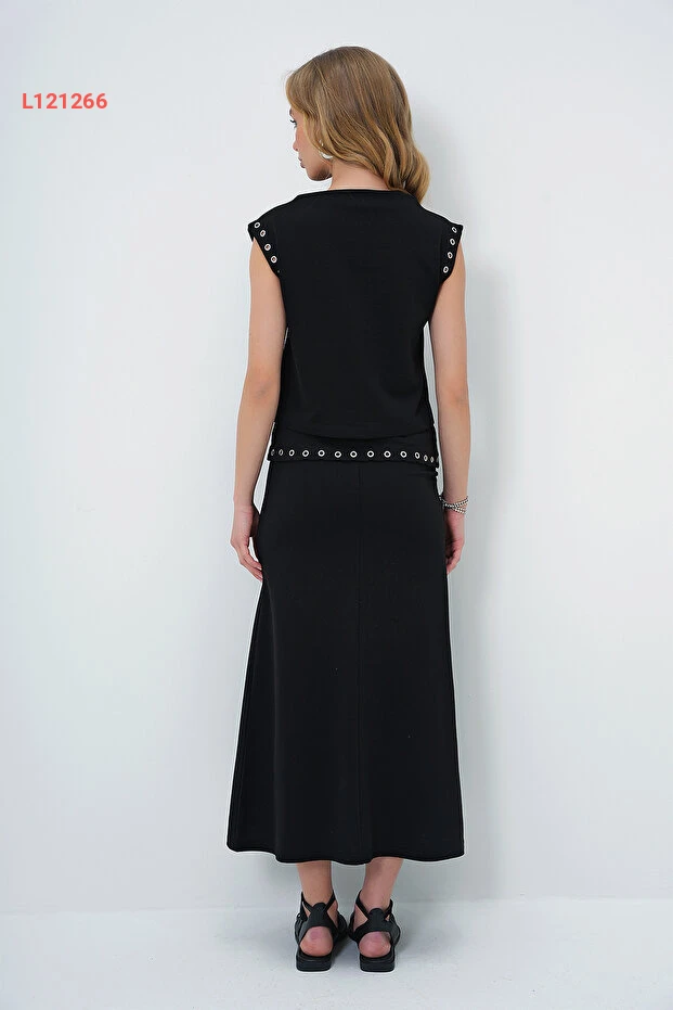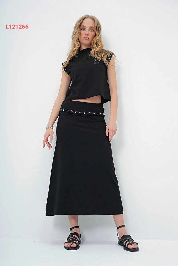 تنسيق الأناقة العصرية: بلوزة وتنورة سوداء ذات طوق دائري للنساء