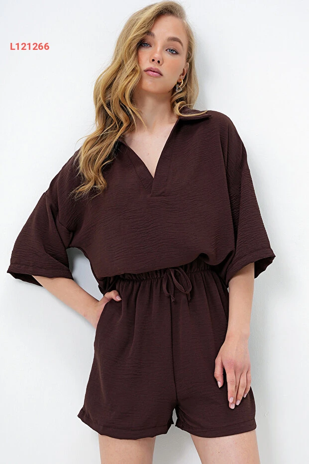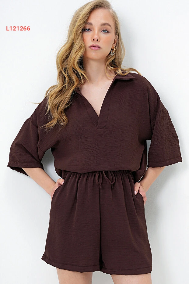 استمتعي بأناقة غير تقليدية مع مجموعة "Trend Alaçatı" المكونة من بلوزة شورت بروزا زاهي بلون بني مفعم بالحيوية. مصممة من قماش الأيروبين الخفيف، توفر لك الراحة المطلقة طوال اليوم، بينما يضفي ياقة البولوزة لمسة عصرية تناسب مختلف المناسبات. ارتديها مع أكسسوارات بسيطة لتبدي متألقة في كل لحظة!