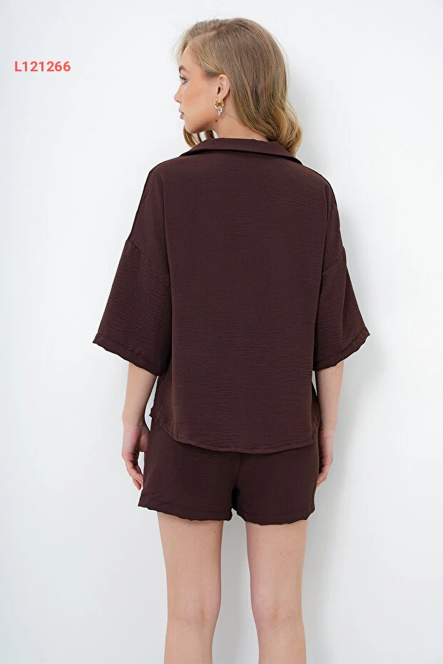 طقم بلوزة وشورت بولو أبيض بني بأسلوب ألجاتي للنساء