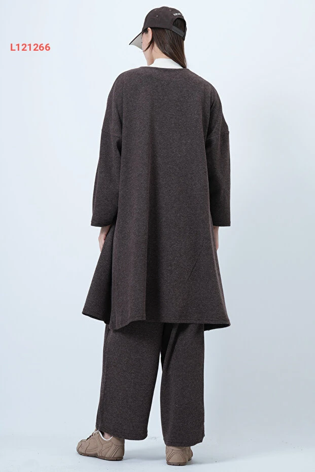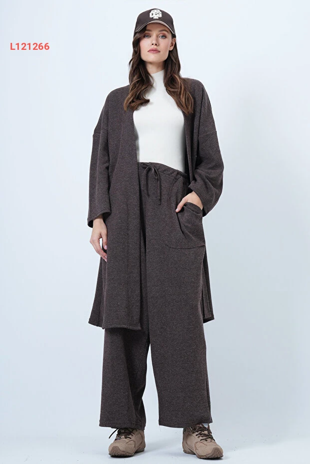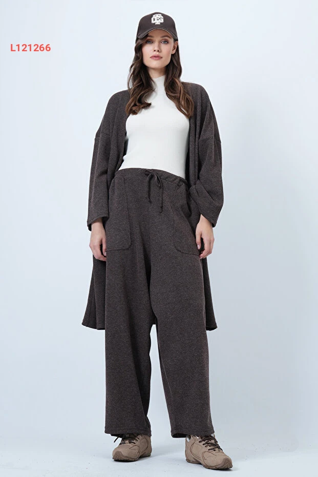 اكتشفي أناقة لا مثيل لها مع طقم الكيمونو الطويل والسراويل الواسعة بأسلوب Alaçatı، الذي يأتي بلون بني داكن جذاب وخامة مُرقّعة فريدة تُضيف لمسة من السحر إلى إطلالتك. مزودًا بجيوب مزدوجة، يضمن لكِ هذا الطقم الراحة العملية والأناقة العصرية، مما يجعله الخيار المثالي لكل مناسبة. ارتديها وتميزي بإطلالة تجمع بين الأناقة والراحة!