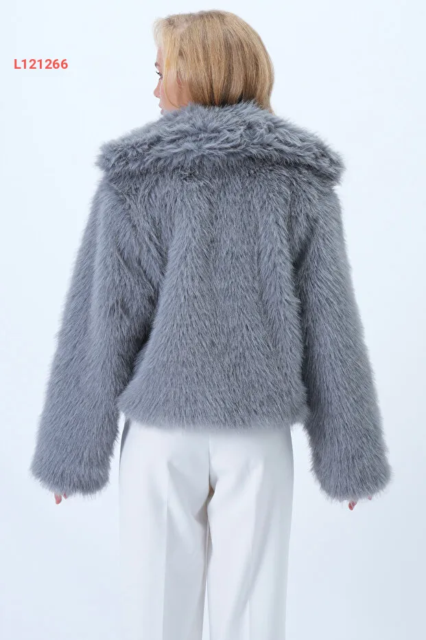 جاكيت فرو بلون رمادي مع ياقة شال وطبقة داخلية من الفرو