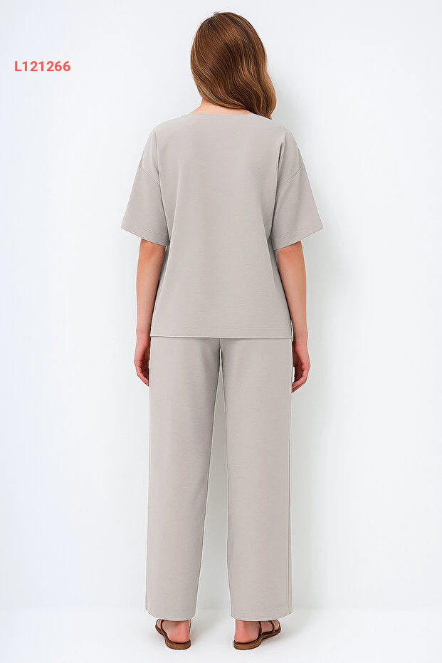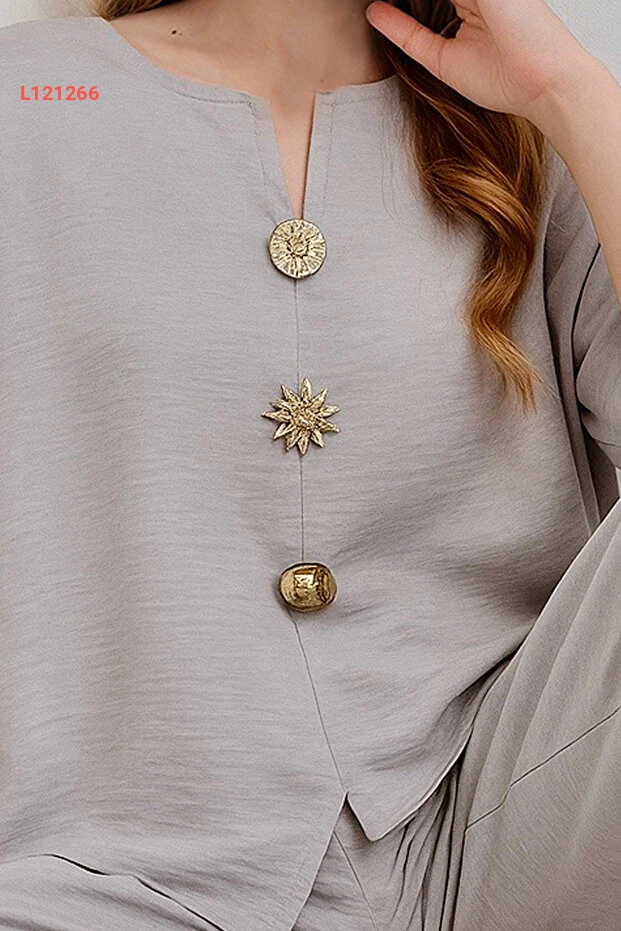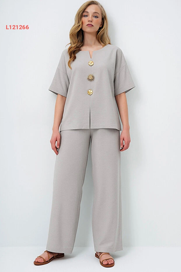 بلوزة وبنطلون بتصميم عَلاجاتي للنساء بلون رمادي مع تفاصيل أزرار ذهبية من القطن الأيروبيني - ALC-X14122