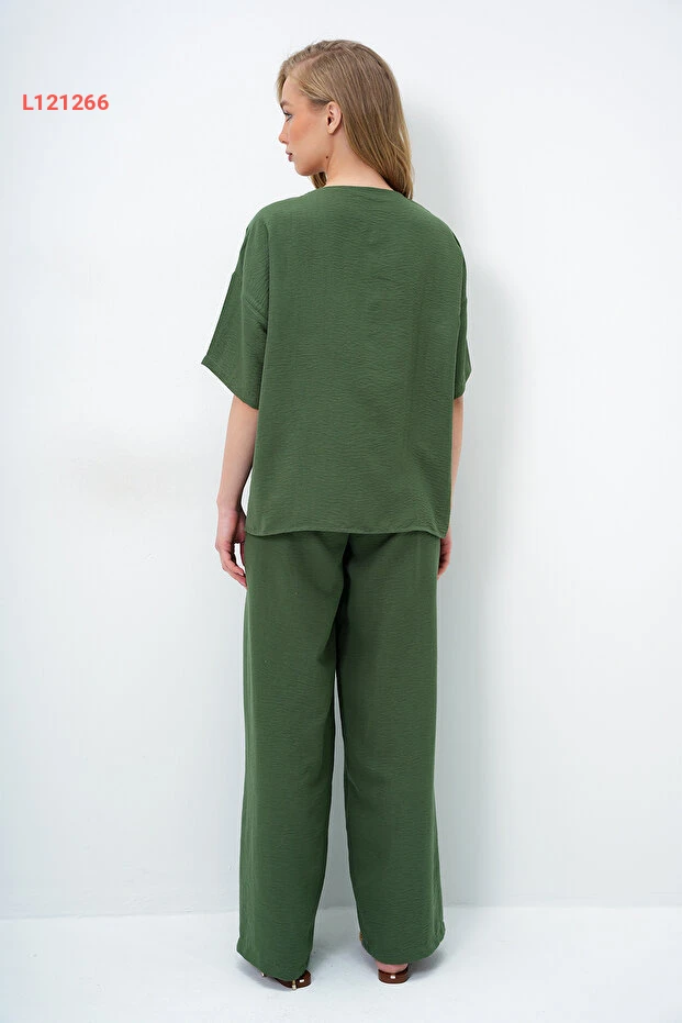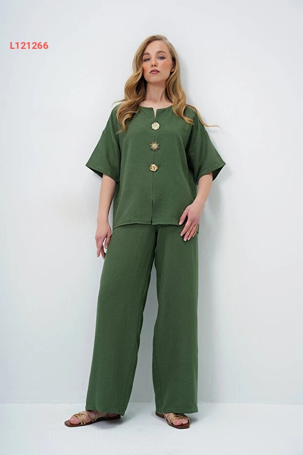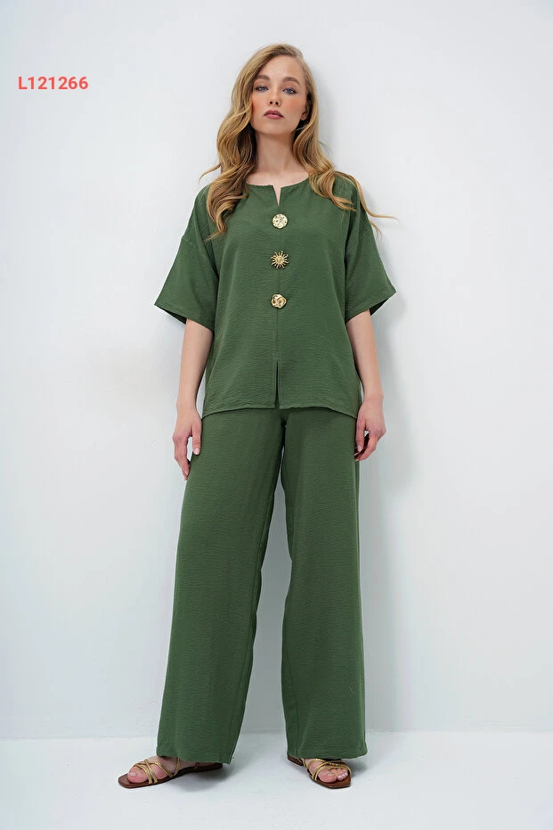 استمتعي بأناقة لا مثيل لها مع مجموعة Trend Alaçatı المكونة من بلوزة بنمط V ياقه وسروال متناسق. تتميز الخامة الأيروبين الخفيفة بأزرار معدنية ذهبية تضيف لمسة عصرية، بينما يضمن اللون الهاكي جاذبية متجددة تناسب جميع المناسبات. اختاري هذه المجموعة لتتميزي بإطلالة مريحة وأنيقة في كل لحظة.