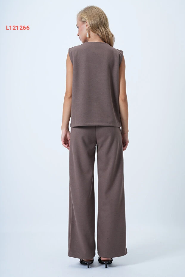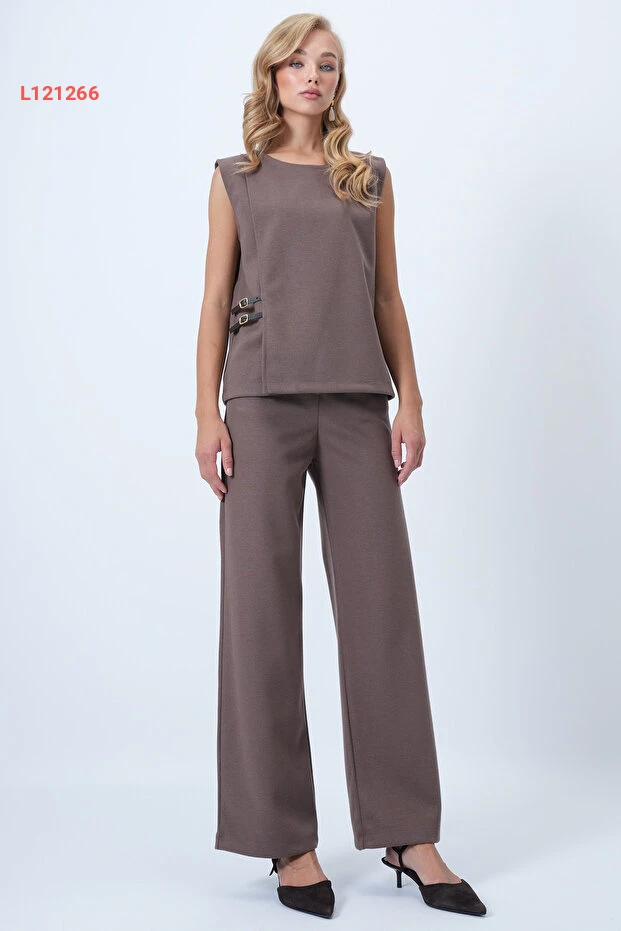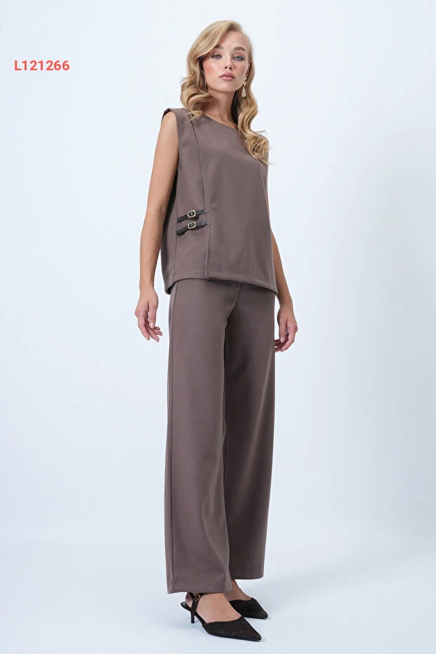 طقم بلوزة كاشي بأكمام قصيرة وبنطلون بالازا من النسيج الفاخر بلون القهوة مع مشبك جلدي
