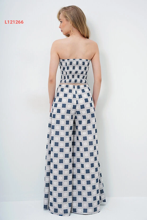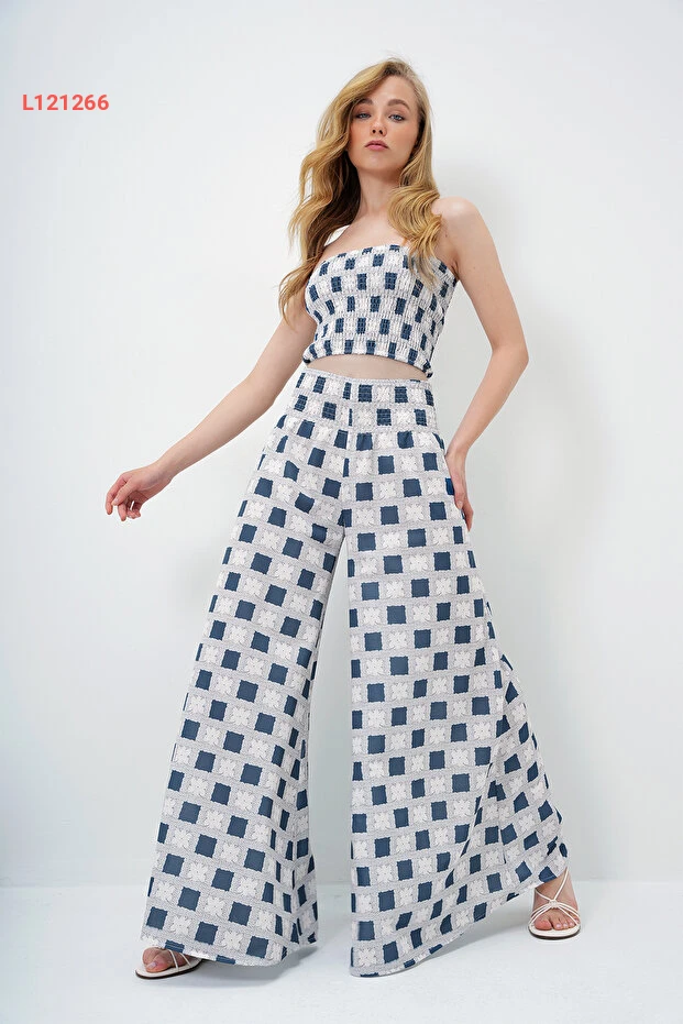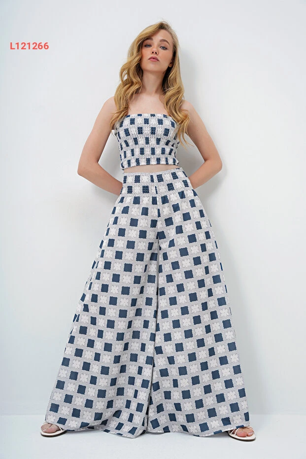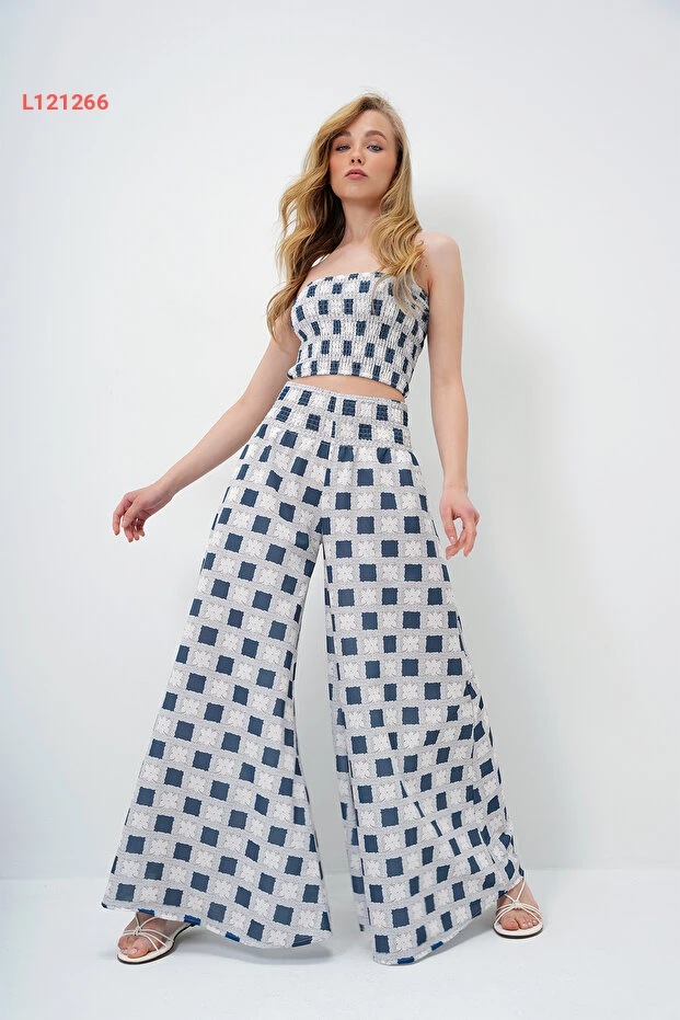طقم بنطلون واسع بخصر مطاطي وبلوزة قصيرة بتصميم عصرية للنساء باللون الأزرق السماوي