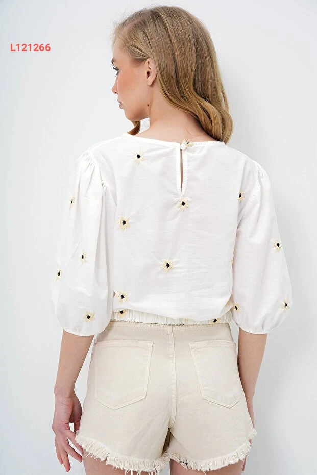 بلوزة كتان بيضاء مزخرفة بأكمام قصيرة بتصميم عصرية من ألاكاتي