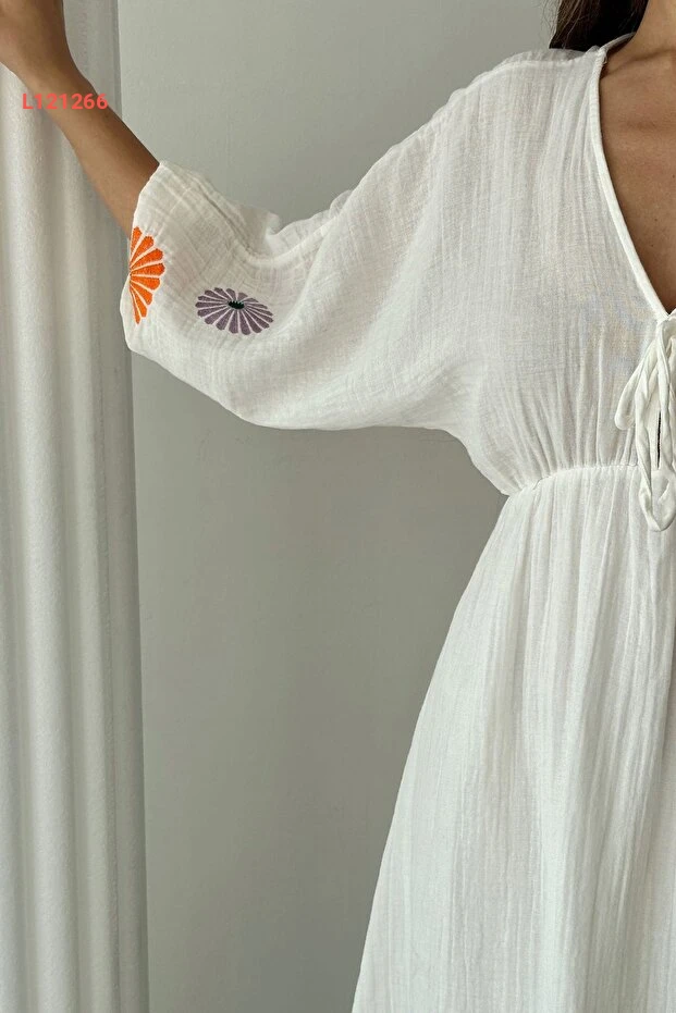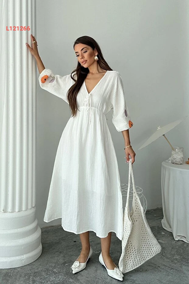 فستان طويل بأكمام منتفخة بياقة على شكل V مع حزام - أسلوب ألاتشاتي، أبيض