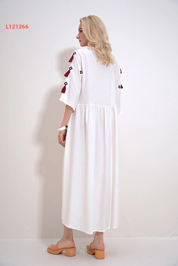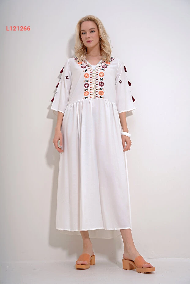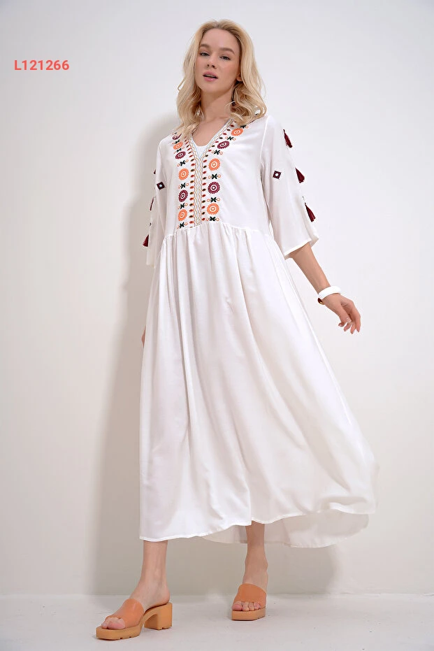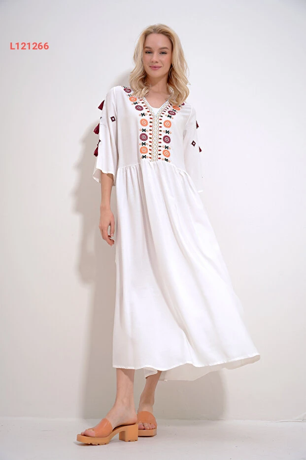 فستان نسائي أبيض بتصميم Alaçatı مع ياقة على شكل V وتفاصيل تطريز وقلنسوة