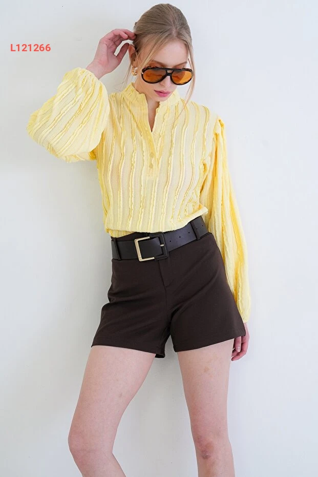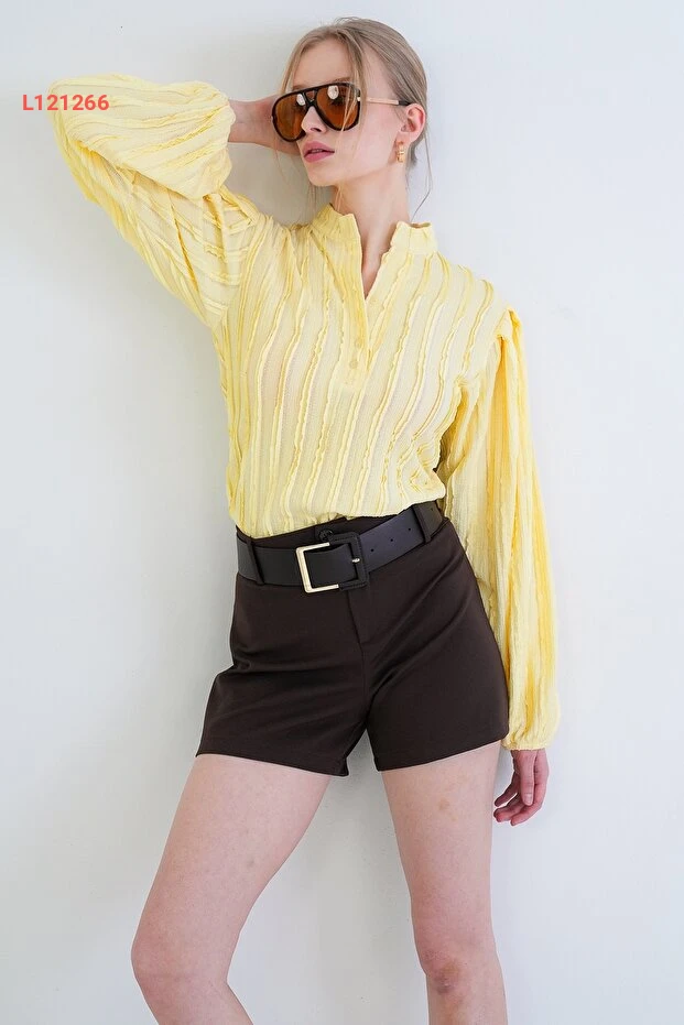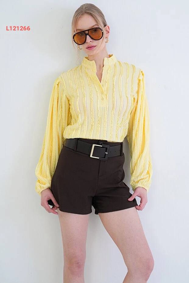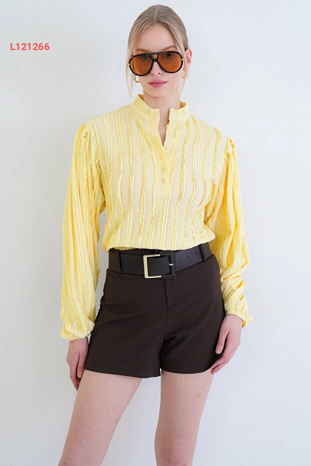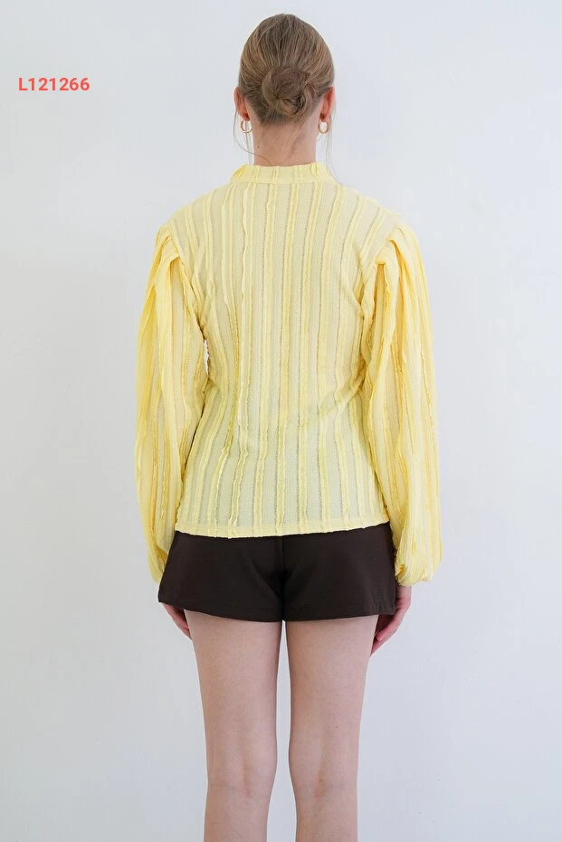 بلوزة بأكمام بالون وقصة مميزة بشكل زهور من قماش فخم باللون الأصفر