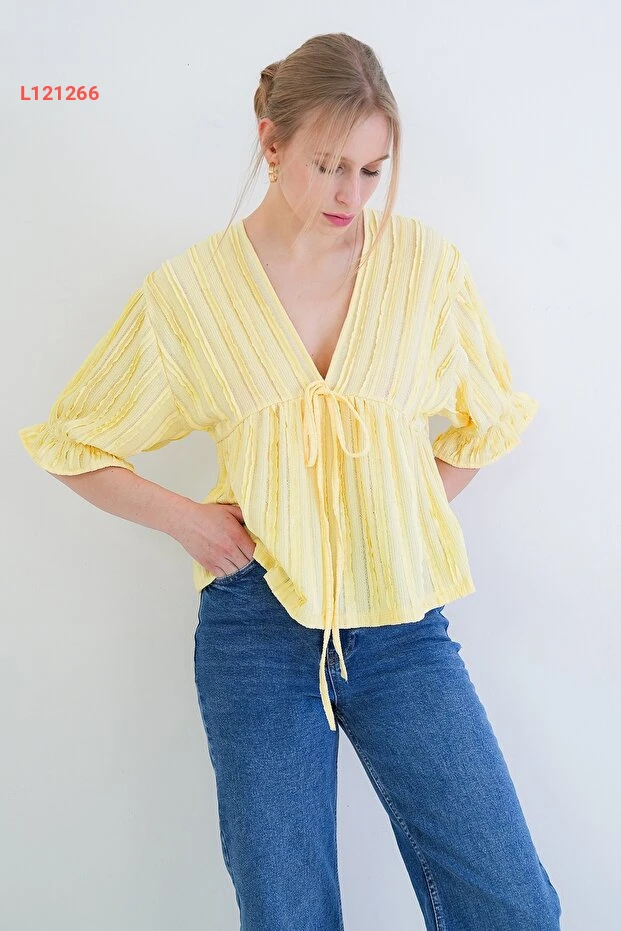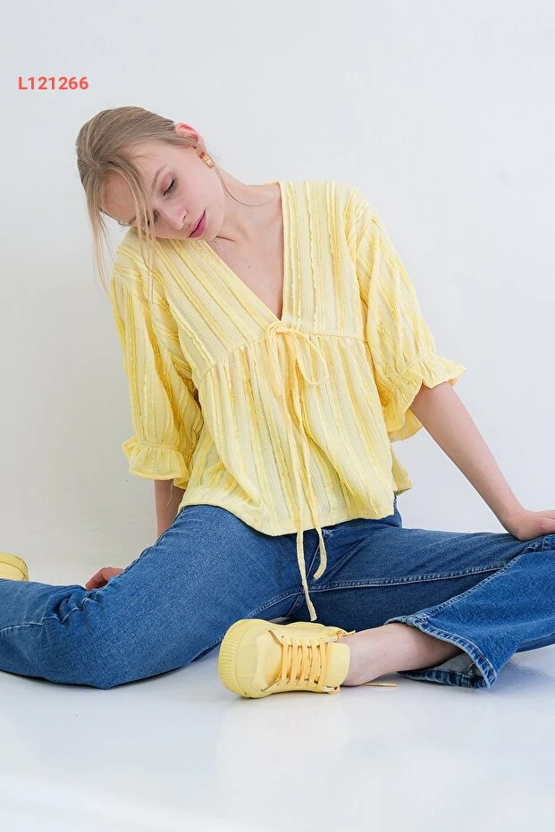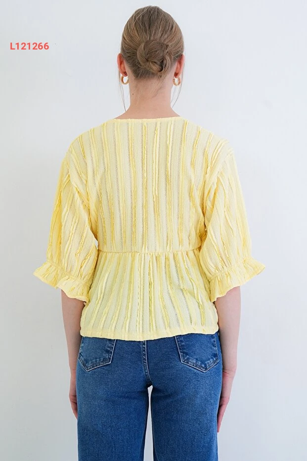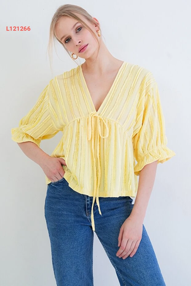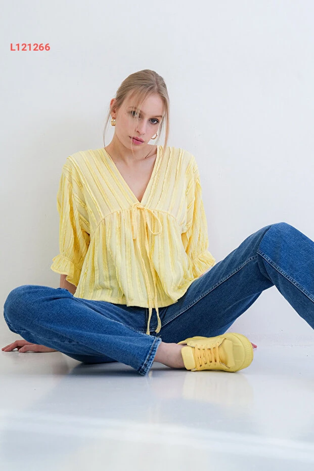 بلوزة ربيعية بالتفاصيل الفاخرة ذات ياقة على شكل حرف V وأكمام ثلاثية الطول بلون أصفر زاهٍ